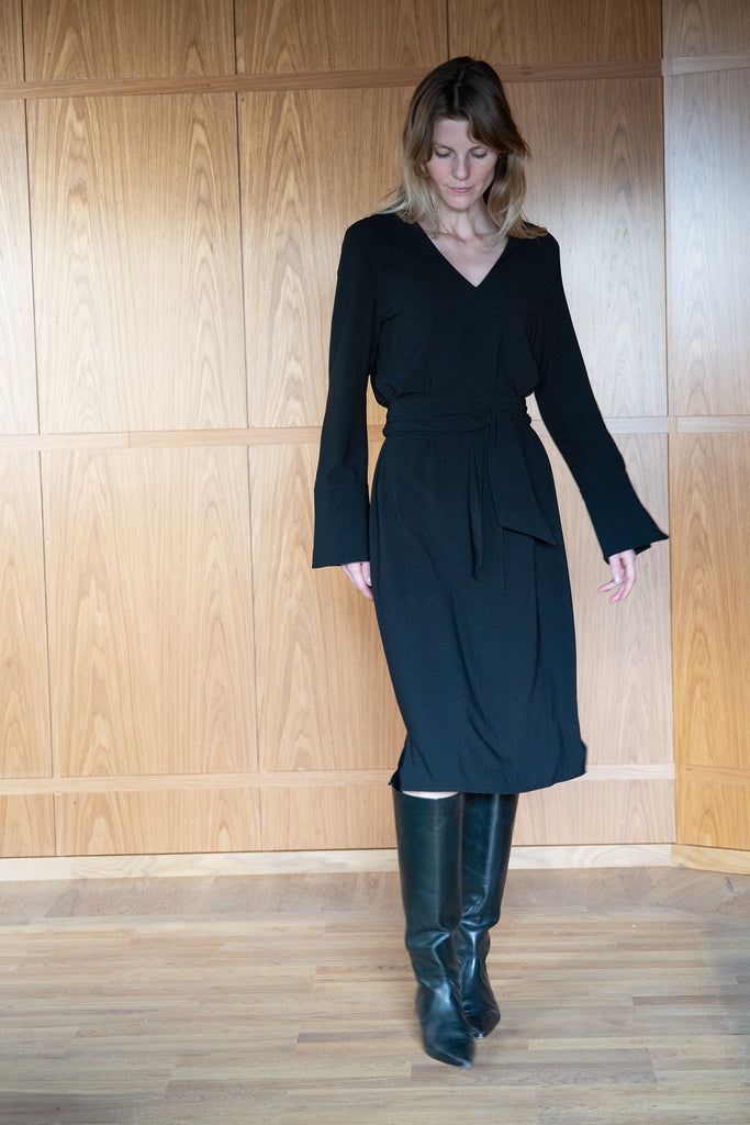 Das Kate-Kleid ist ein Midikleid mit V-Ausschnitt, langen Ärmeln mit Bündchen und einem dazugehörigen Gürtel, der Ihre Silhouette betont.
