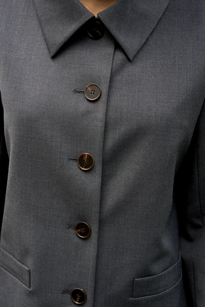 Tailored and minimal. The Broco Blazer is a short blazer cut from wool stretch with a sharp shirt collar, tonal buttons and discreet front pockets. Designed to sit neatly at the hip for a clean, structured look — easy to wear with denim or wide-leg trousers.