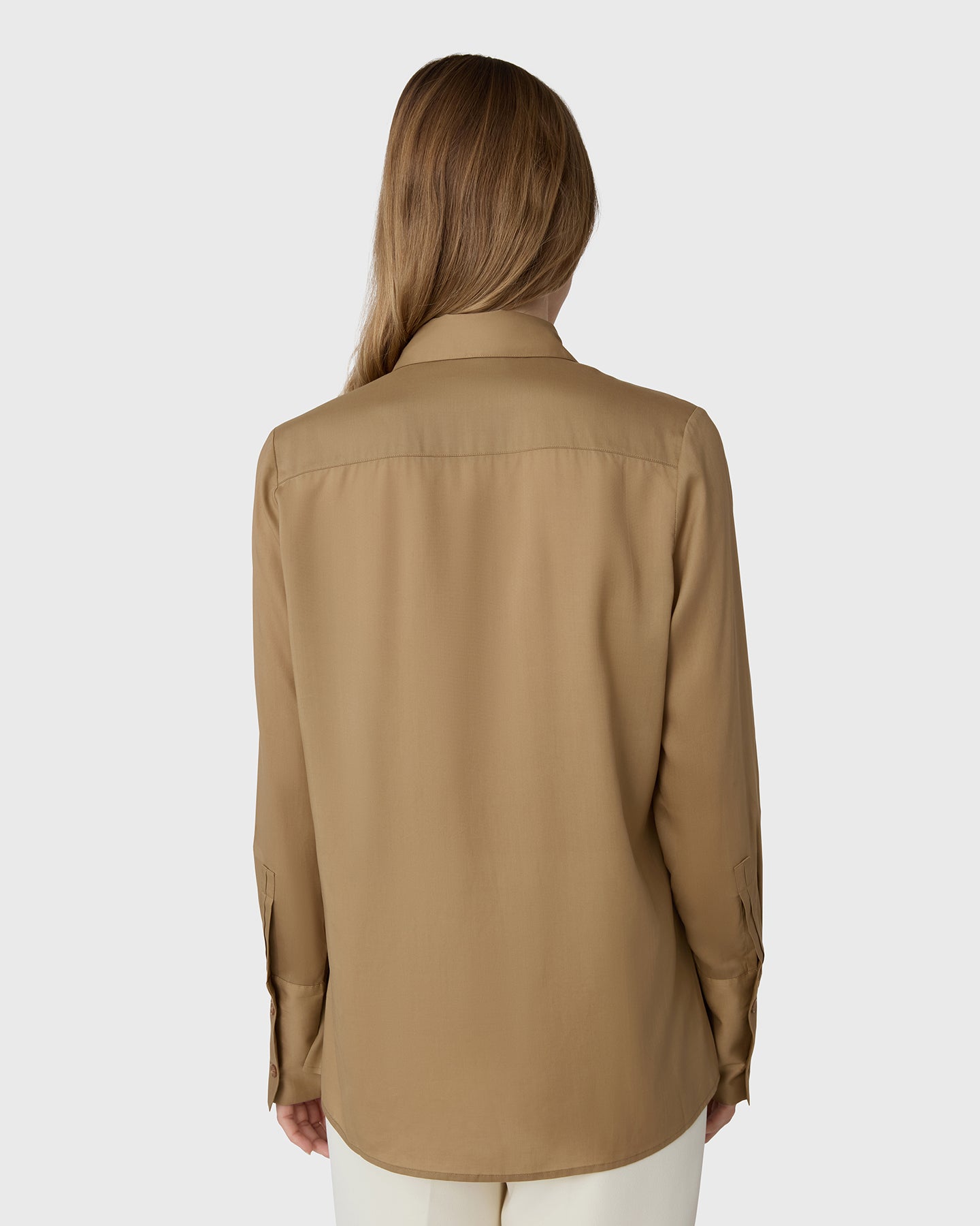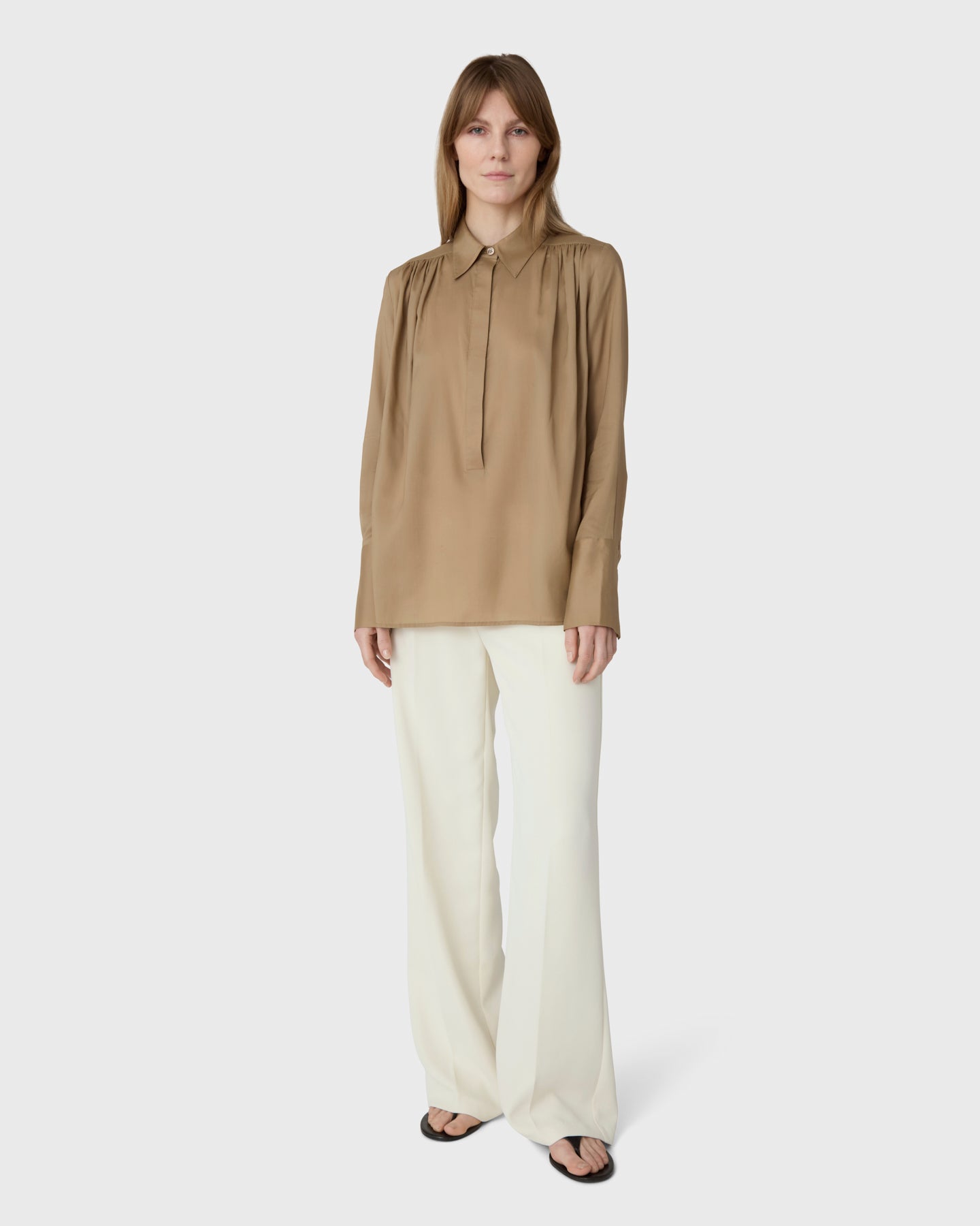 The Maya Blouse is a long-sleeved blouse with decorative pleats, cut in a light, slightly sheer fabric. The fluid quality and subtle detailing create a soft, feminine expression. Pair with tailored trousers for a more polished look, or with denim for understated ease.