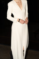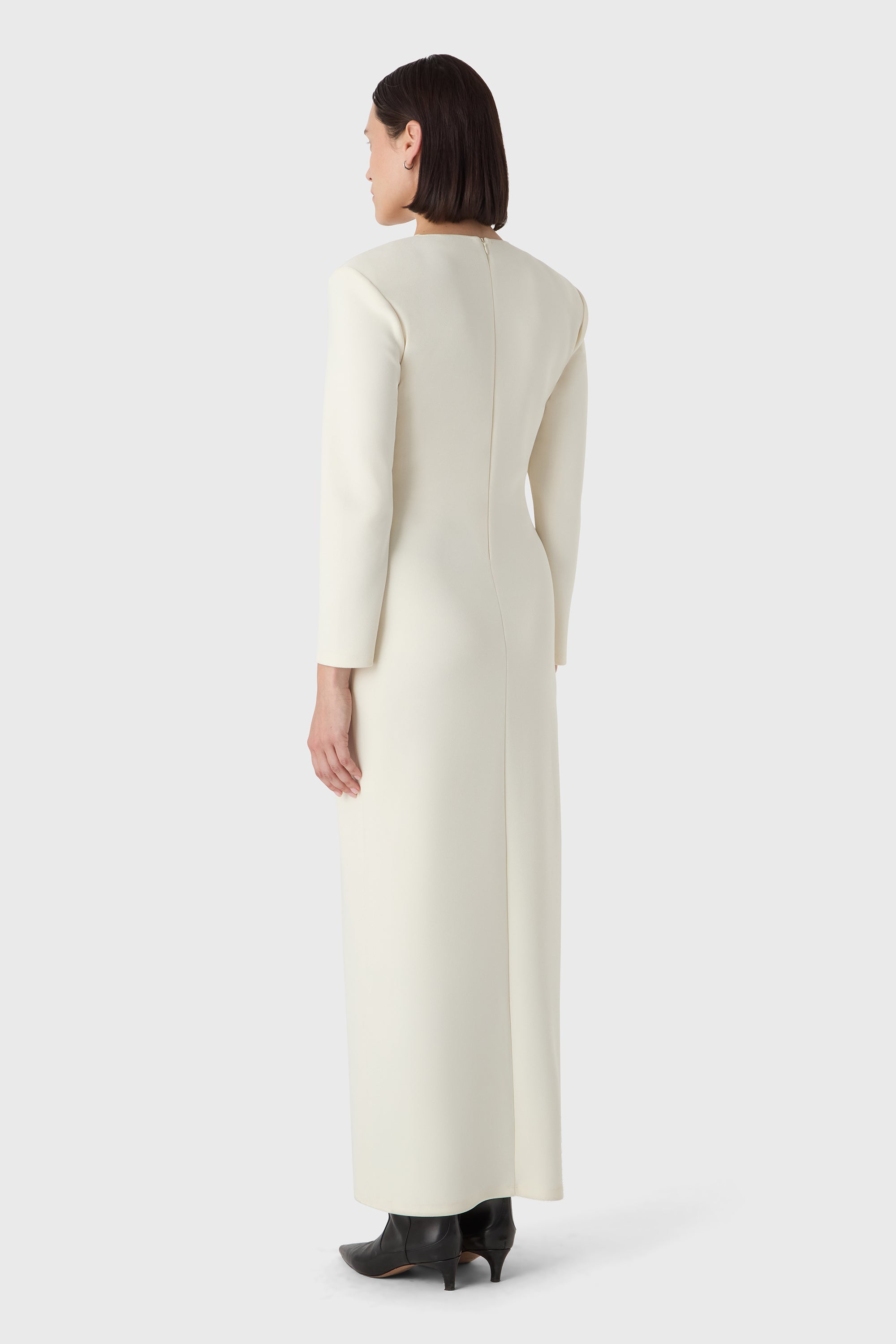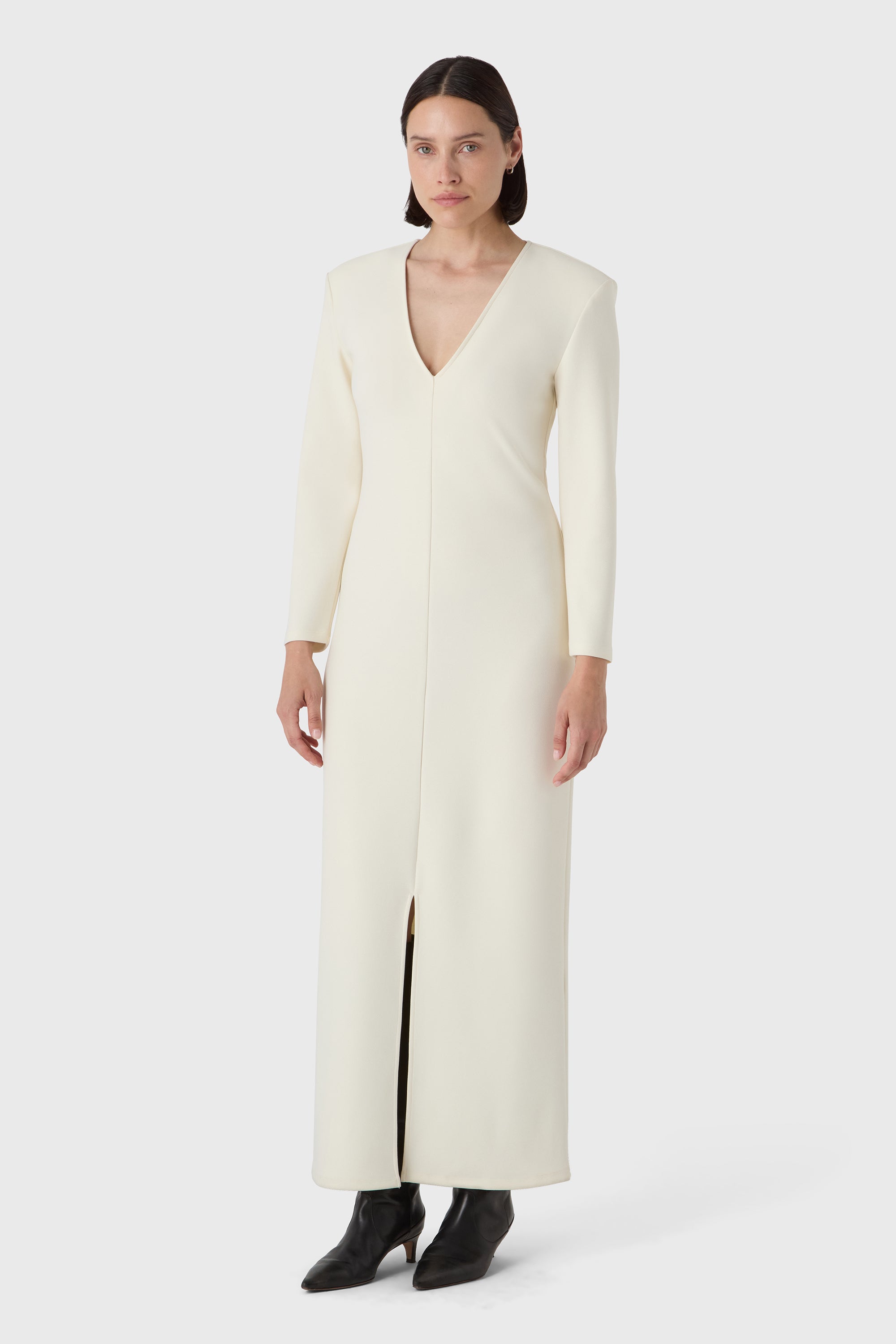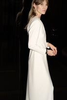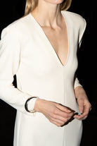 Mutig und minimalistisch. Das Valerie Kleid besteht aus formendem Superstretch-Jersey-Crêpe mit tiefem V-Ausschnitt, langen Ärmeln und definierten Schultern. Eine klare Silhouette, die eine stille Aussage macht – elegant aus jedem Blickwinkel.