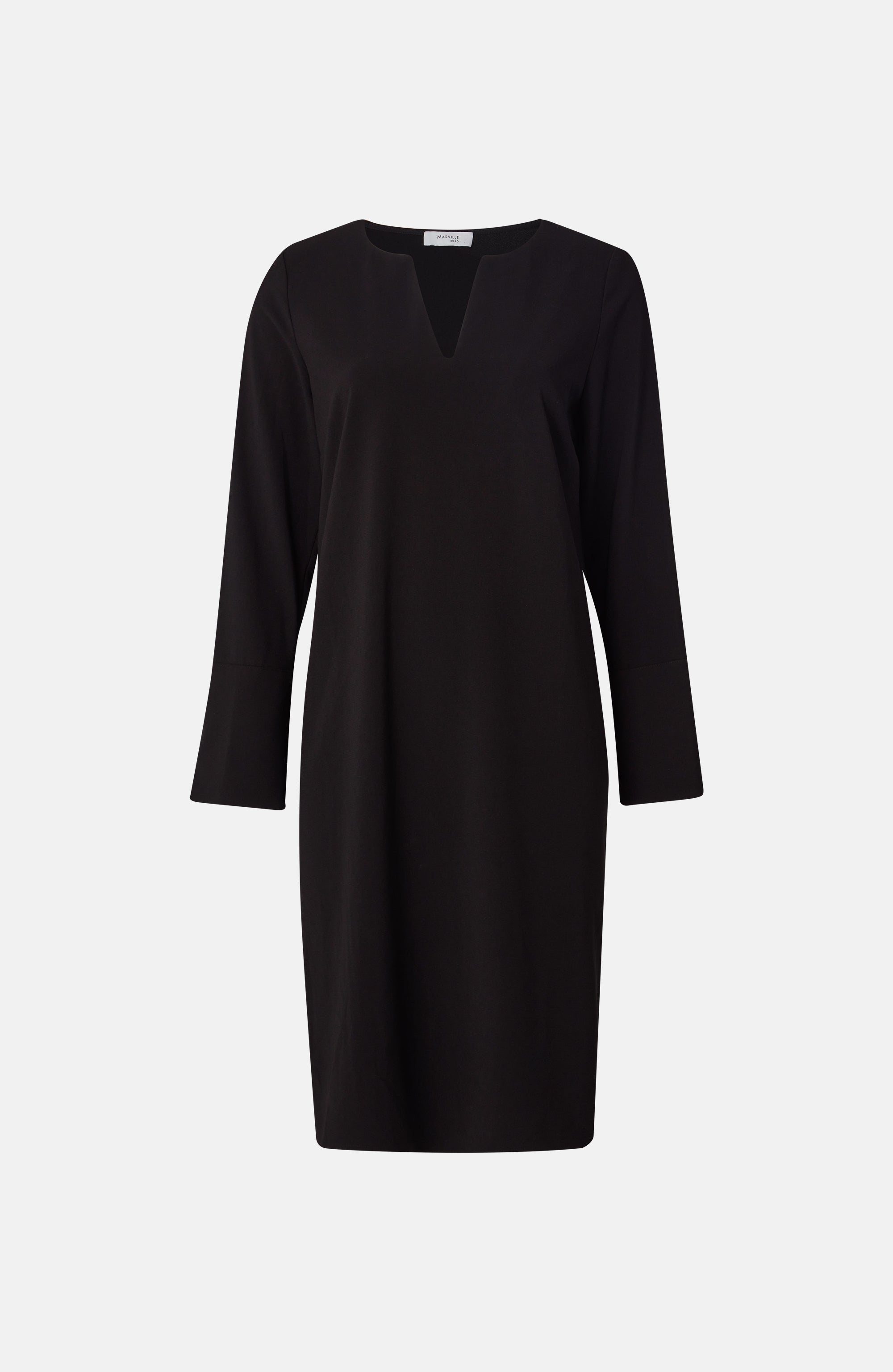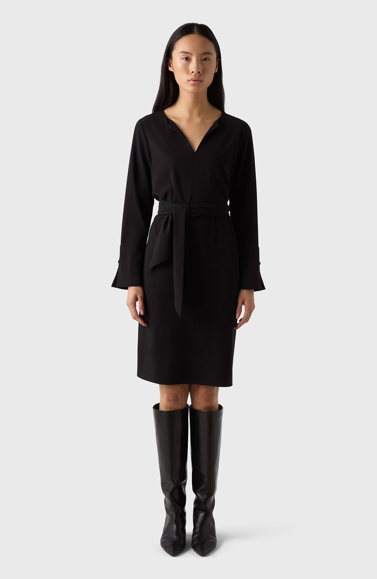 Semi-V-necked dress with long sleeves with large cuffs and fabric-covered buttons. Efva is the perfect everyday dress, suitable for all occasions. Wear as it is or wrap yourself up with the belt for a feminine silhouette.