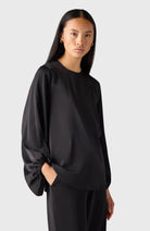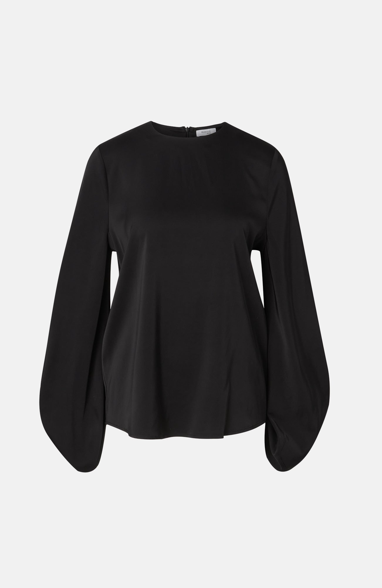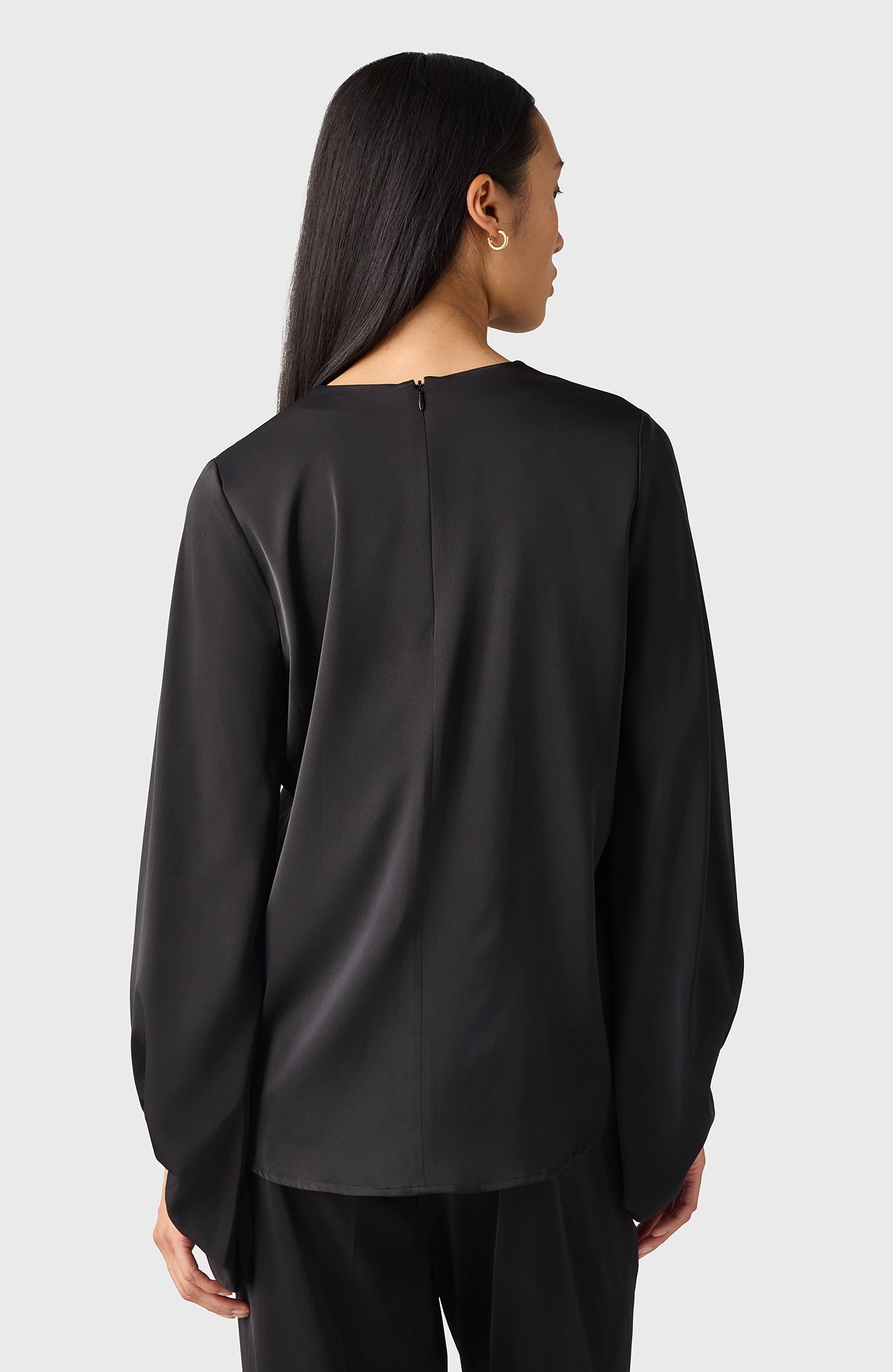 The Deborah Top is a round-necked, long-sleeved top made from satin stretch. It features gathered sleeve ends that add an elegant and voluminous touch. Pair it with tailored trousers for a modern workday ensemble or your favorite denim.