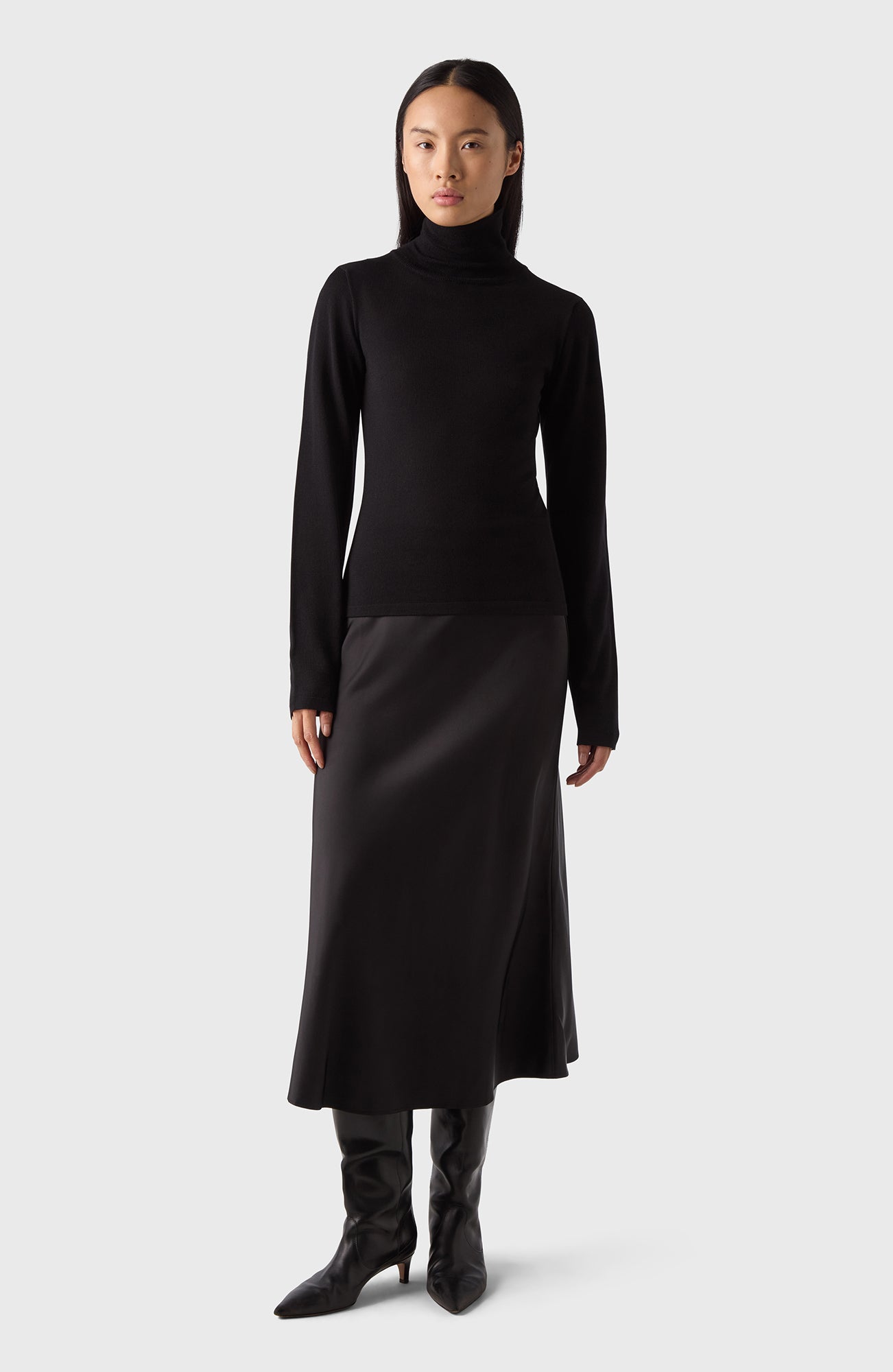 The Turtleneck comes in black and has a slim fit. It's crafted from 100% super soft merino wool, offering both warmth and comfort. Wear it with tailored trousers to dress up or denim to dress down.