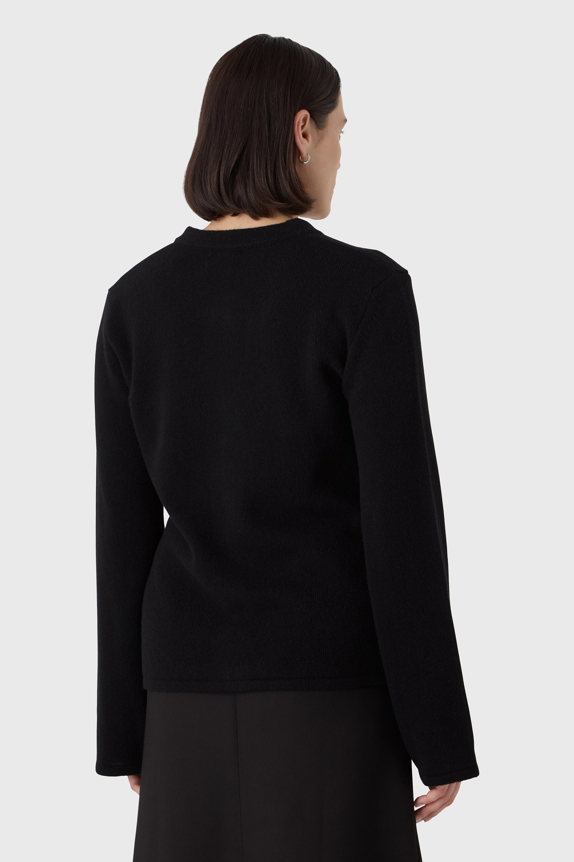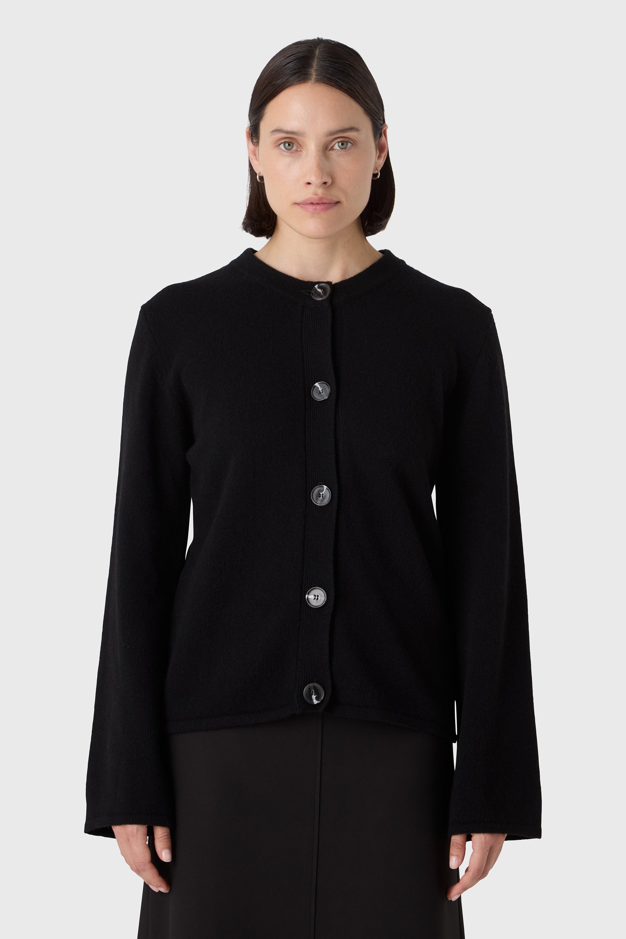A clean, sculptural knit. The Elise Cardigan is made from 100% soft wool and shaped with a round neckline, wide sleeves and tonal horn buttons. Easy to wear with trousers, denim or a soft skirt — at work or off duty.