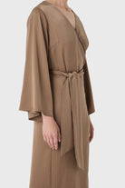 The Mira Dress is our signature wrap style – a timeless piece designed to move and breathe with you. Crafted from soft satin stretch, it drapes beautifully over the body while offering complete ease of wear. The wide sleeves and waist tie create a flattering shape that works as well for the office as it does for evening events. A go-to dress for when you need effortless elegance.