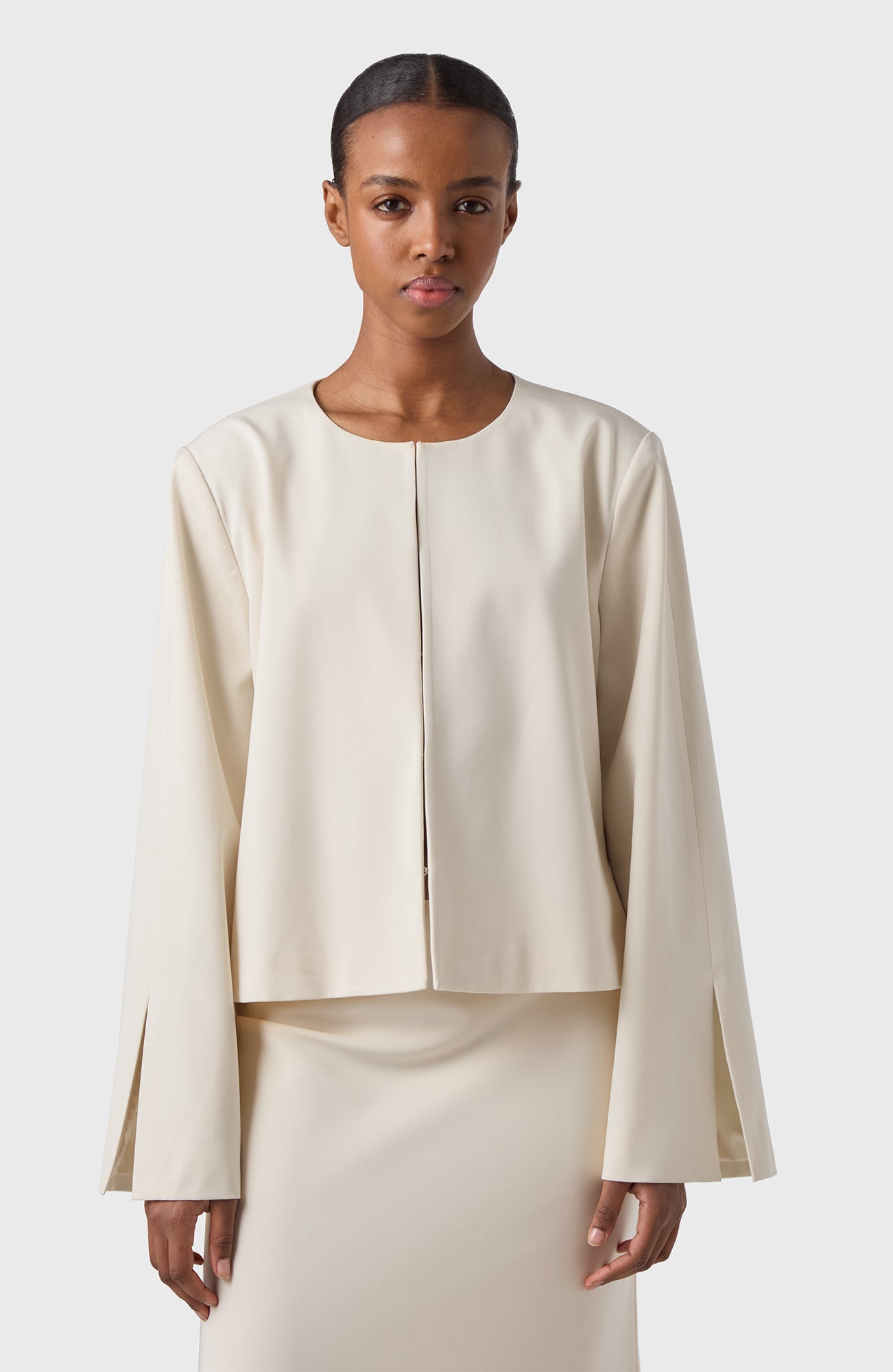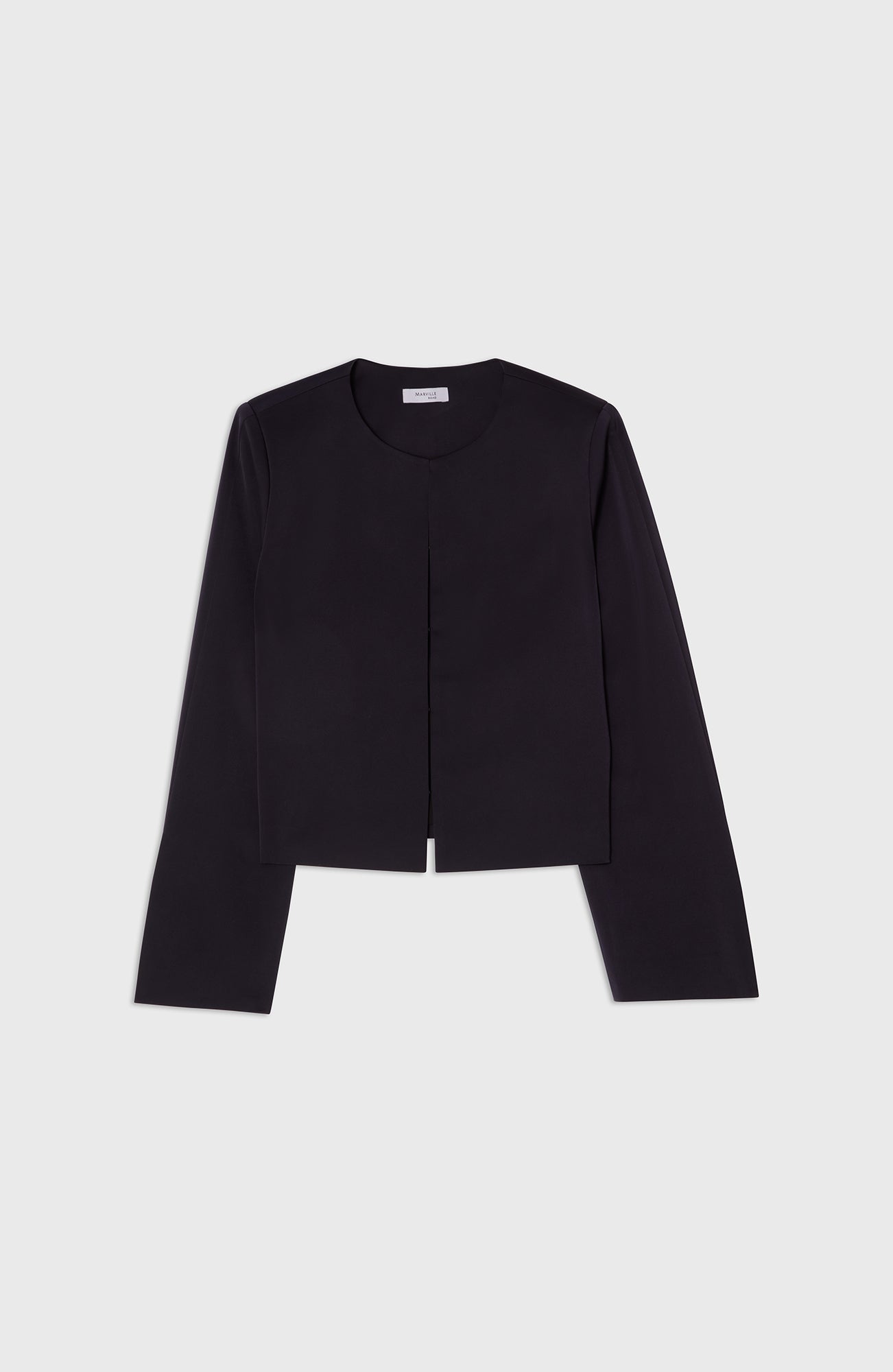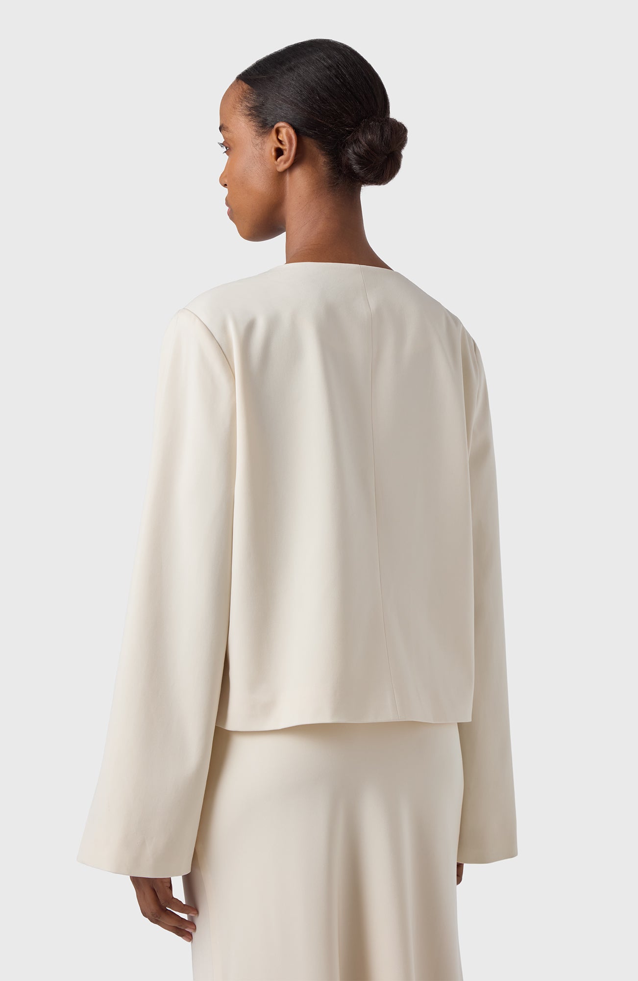 Round necked short festive jacket in our sleek and comfortable satin stretch quality.