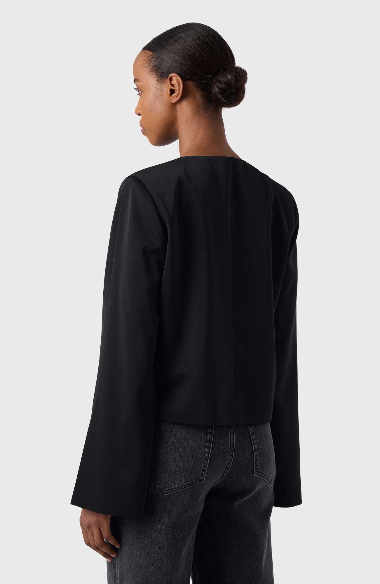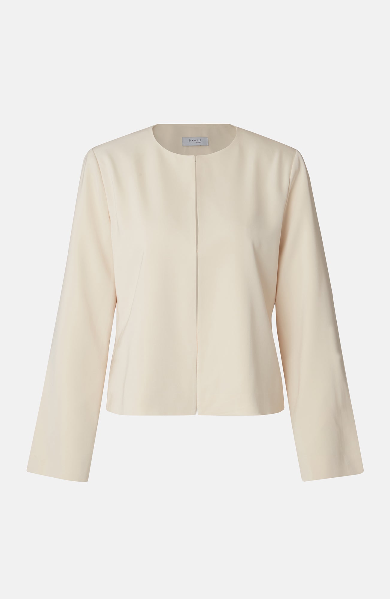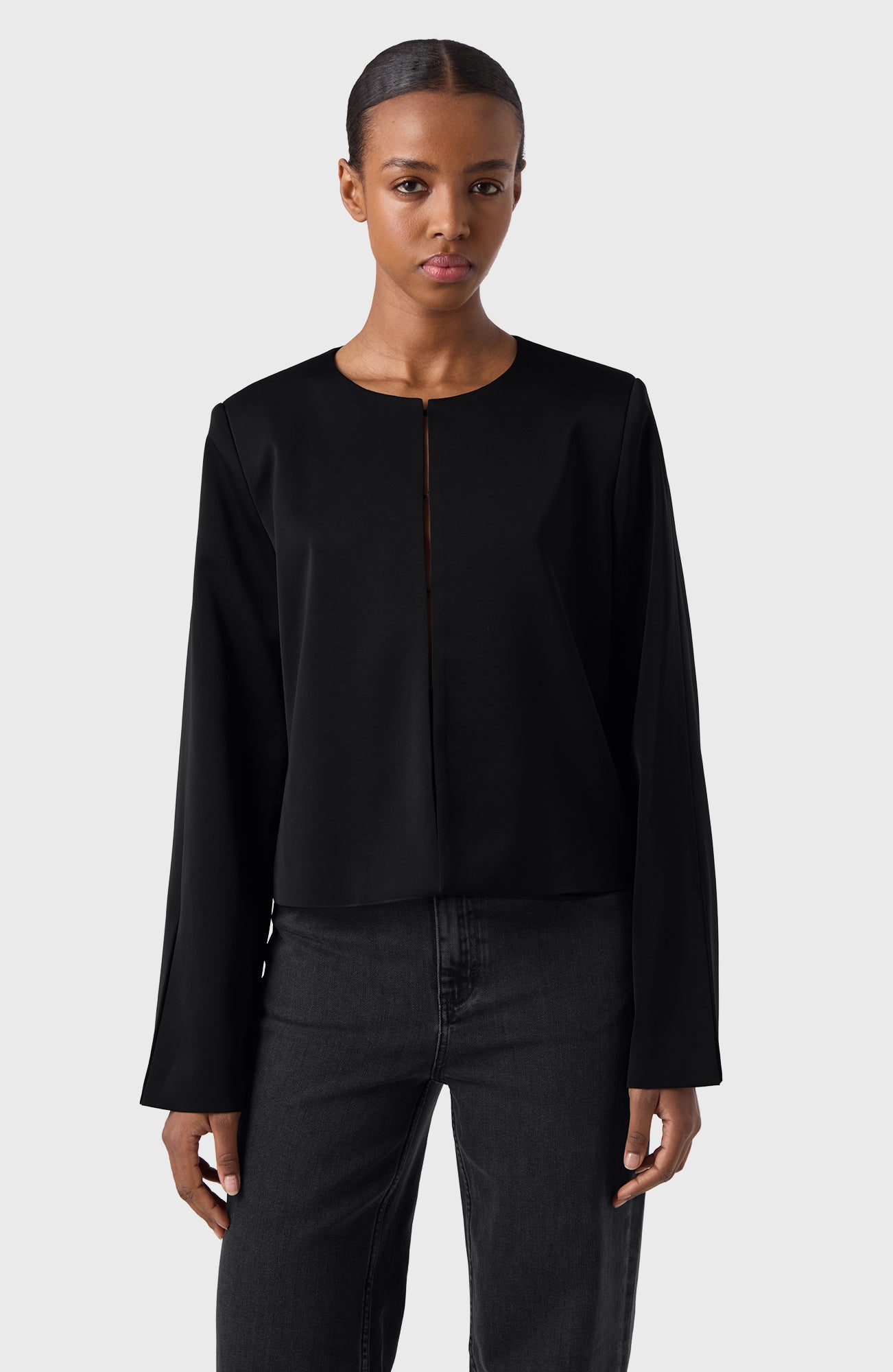 Round necked short festive jacket in our sleek and comfortable satin stretch quality.