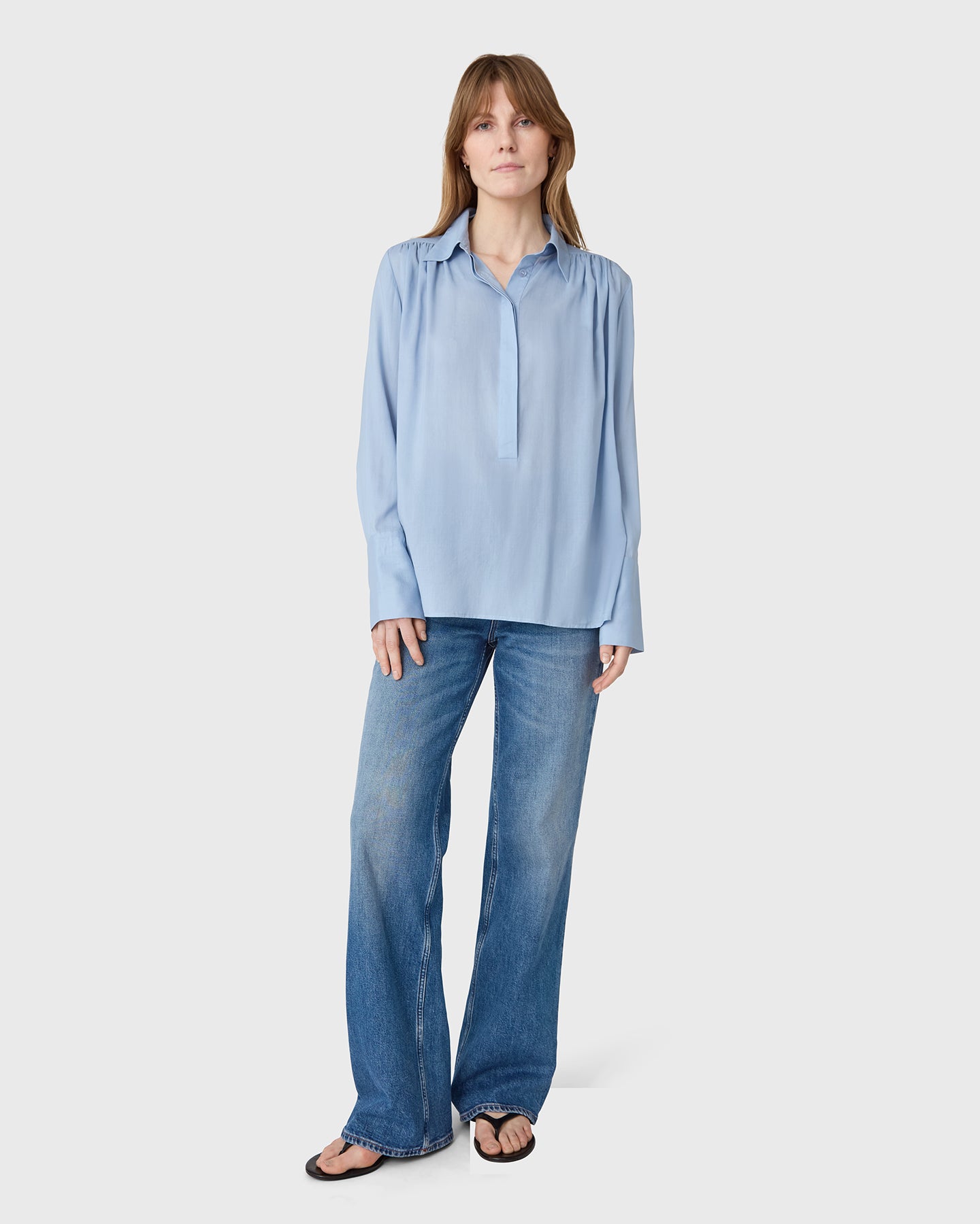 The Maya Blouse is a long-sleeved blouse with decorative pleats, cut in a light, slightly sheer fabric. The fluid quality and subtle detailing create a soft, feminine expression. Pair with tailored trousers for a more polished look, or with denim for understated ease.