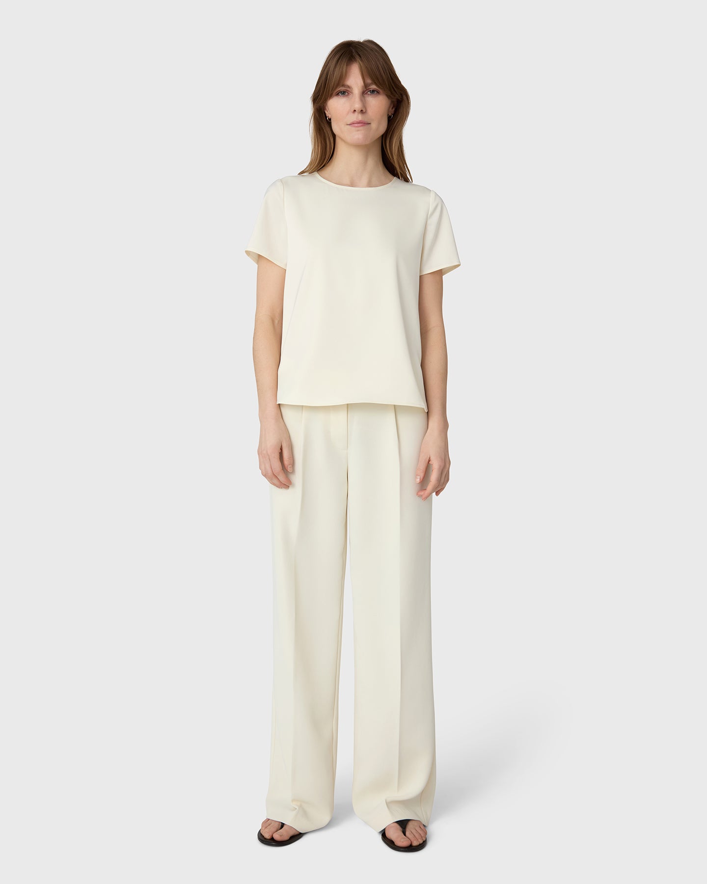 The Lorna Satin Top is a round-neck, short-sleeved top in satin stretch with a neck detail. Wear on its own or under a blazer with tailored trousers or denim.