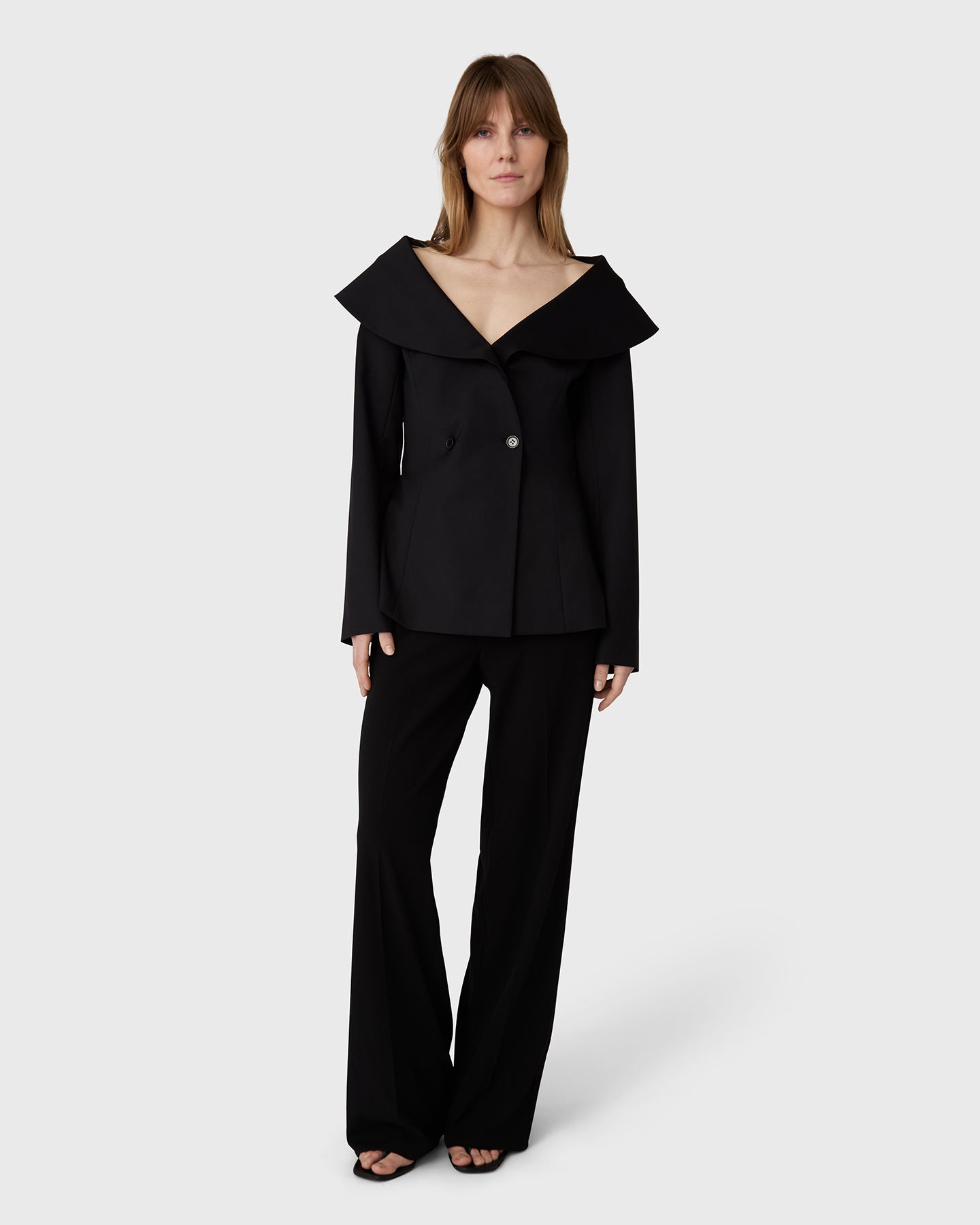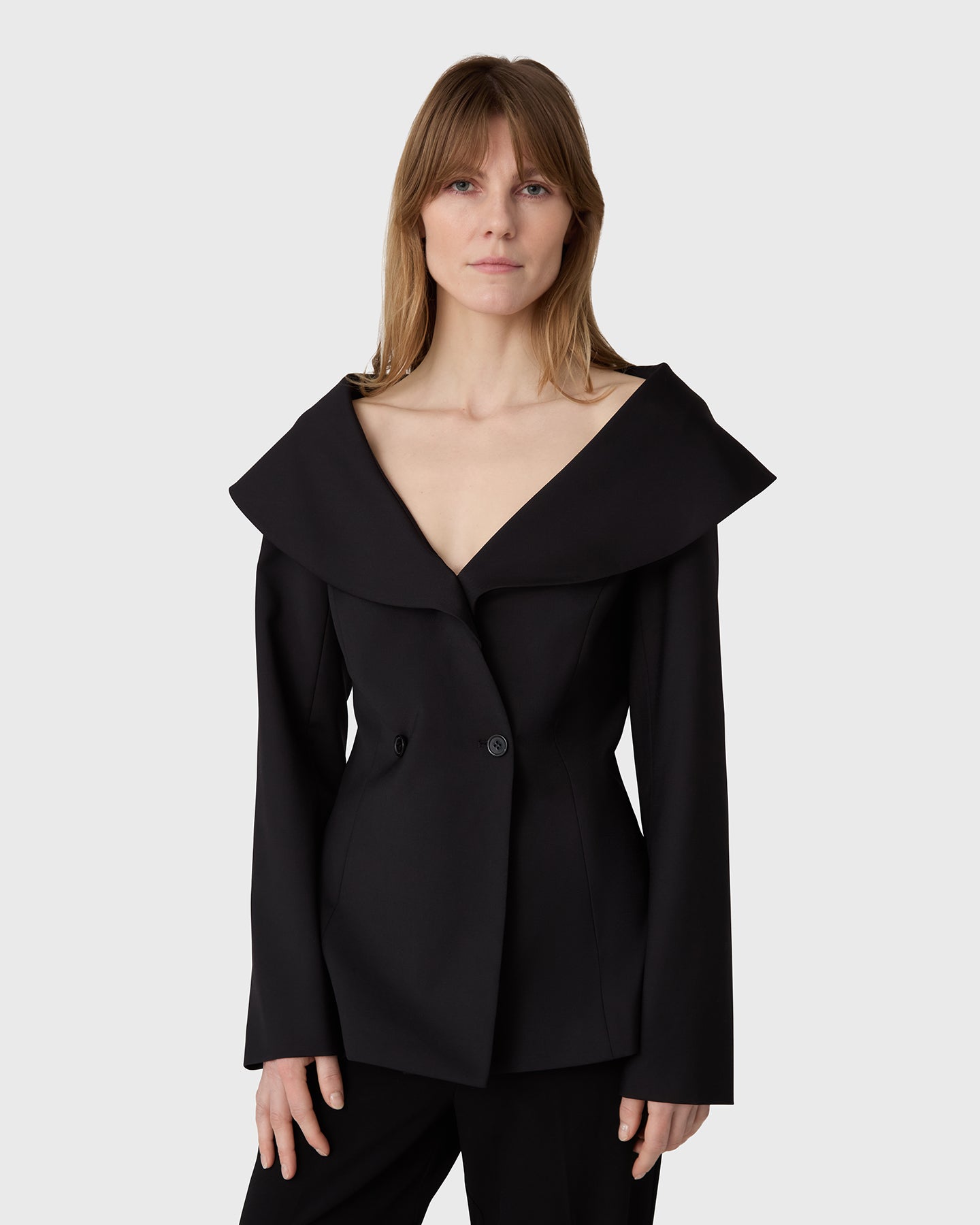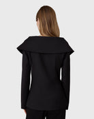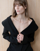 The London Off Shoulder Wool Blazer is crafted from fine wool with a deep neckline, an off shoulder silhouette, and a shaped waist for a refined look.