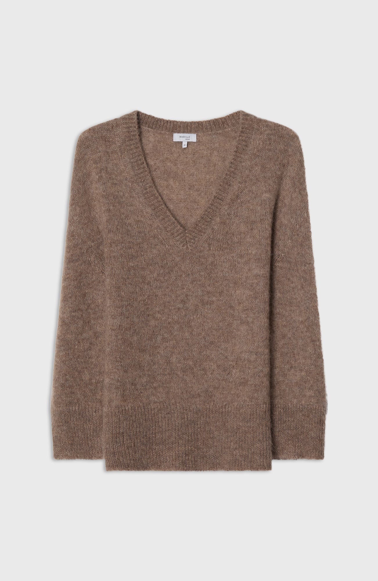 Soft structure, subtle volume. The Giulia Alpaca Jumper is knitted from supersoft alpaca yarn with a lightly brushed texture, dropped shoulders and a flattering V neckline. A warm yet airy favourite — perfect for layering or wearing on its own.