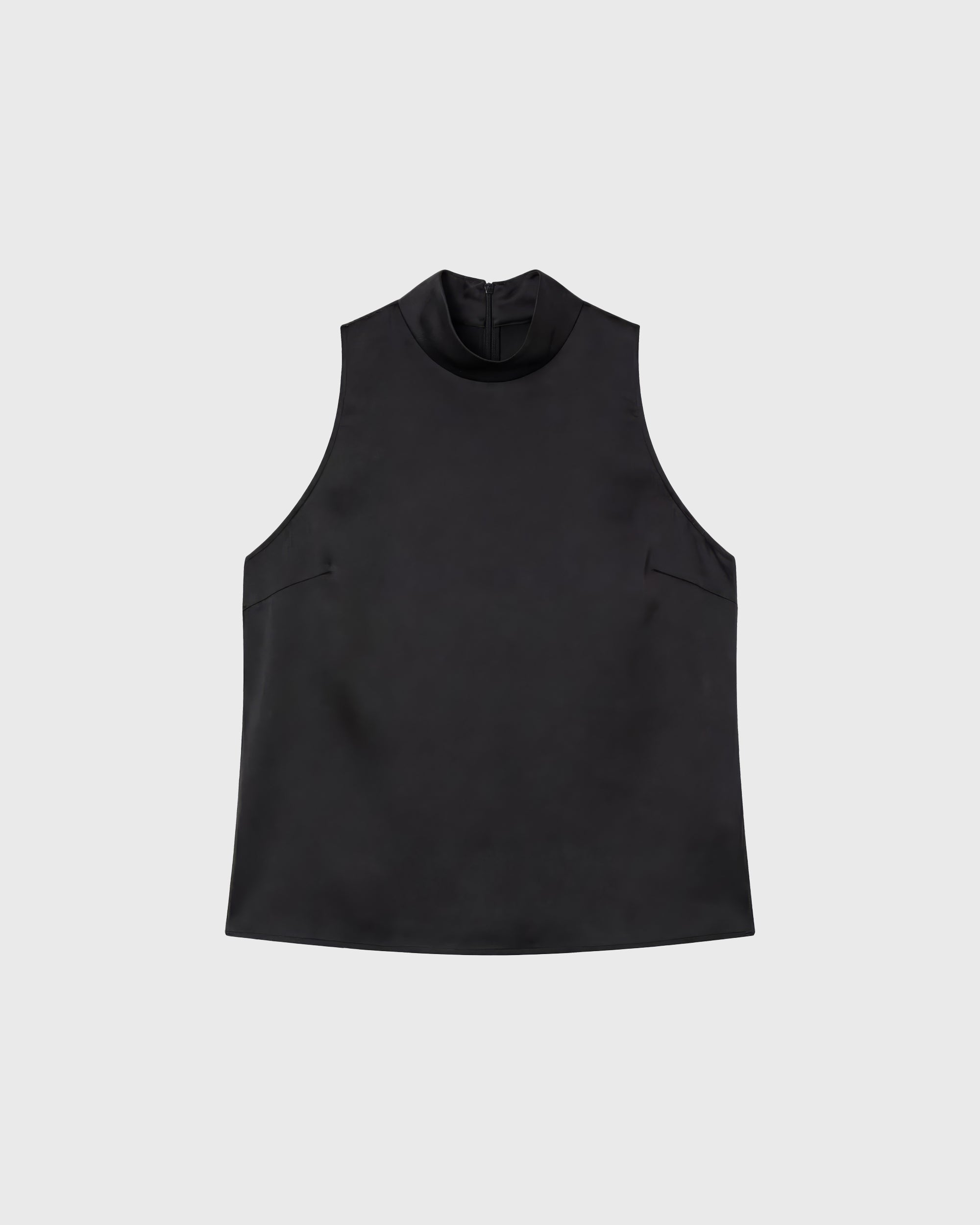 The Zeta Top is a sleeveless halterneck top with a stand-up collar in satin stretch.