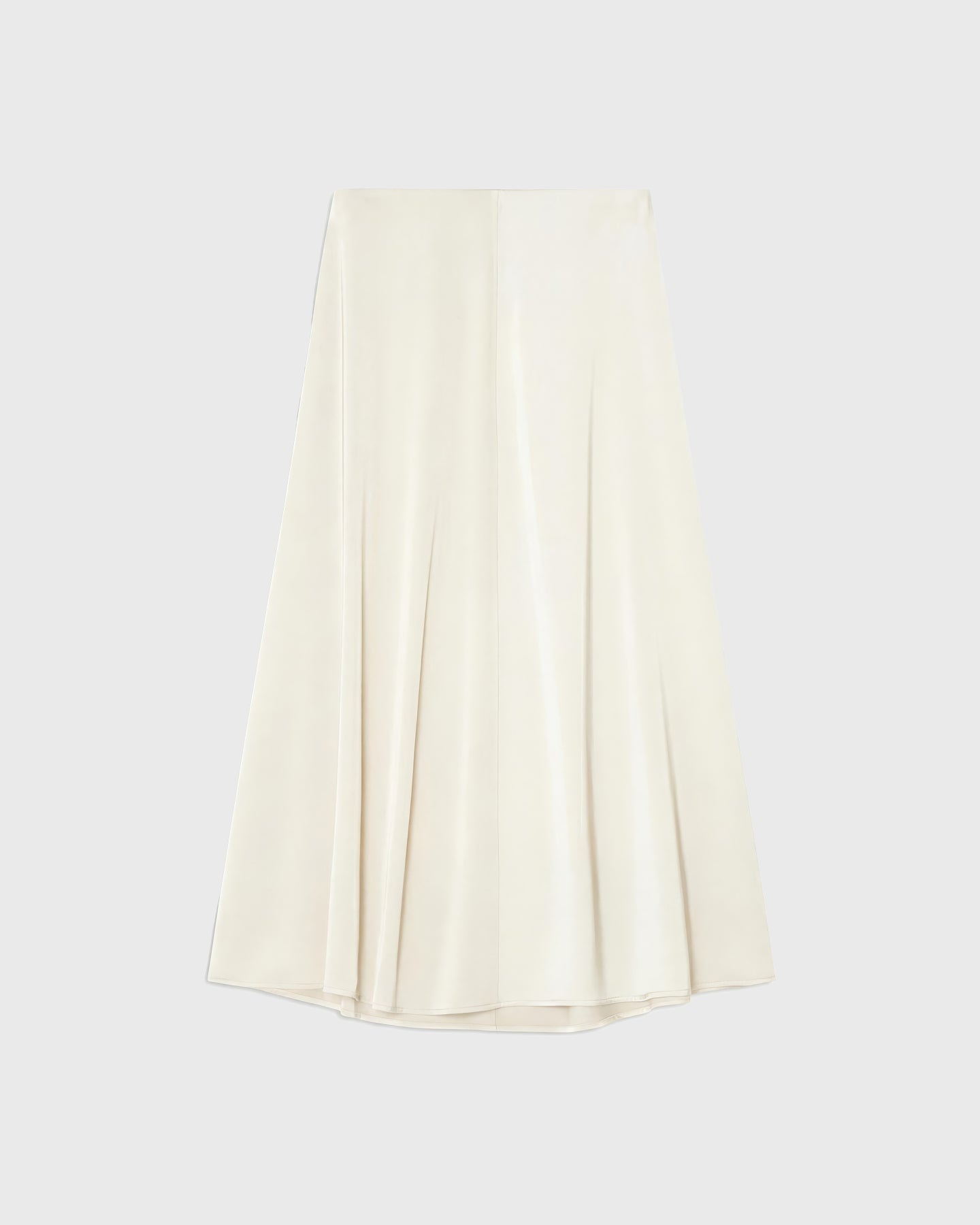 The Rhonda Satin Skirt is an ankle-length skirt in satin stretch with a softly draped silhouette. A subtle front seam adds a clean, refined expression. Pair with the matching Mia Satin Top for a cohesive look, or style with a simple tank for understated ease.