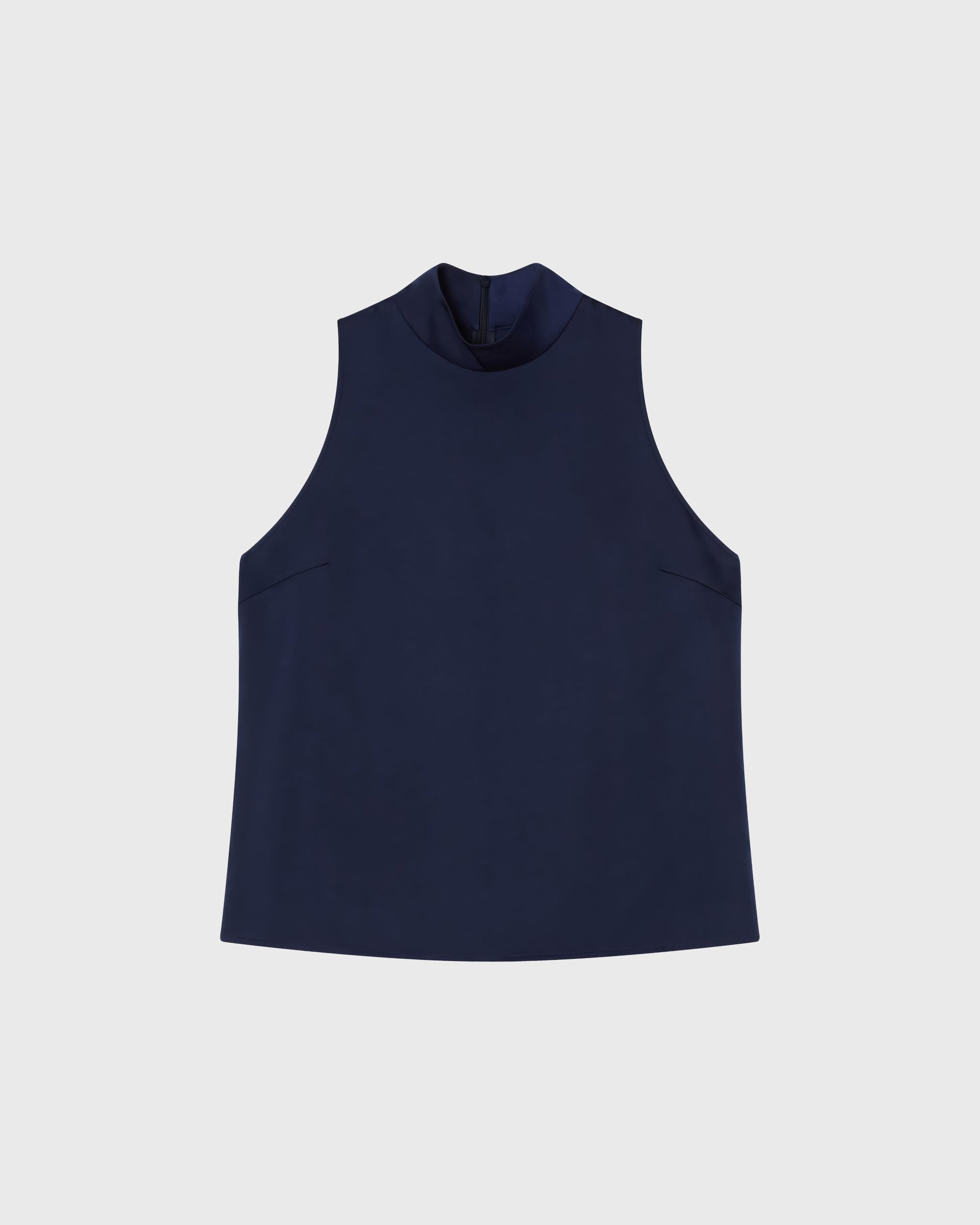 The Zeta Top is a sleeveless halterneck top with a stand-up collar in satin stretch.