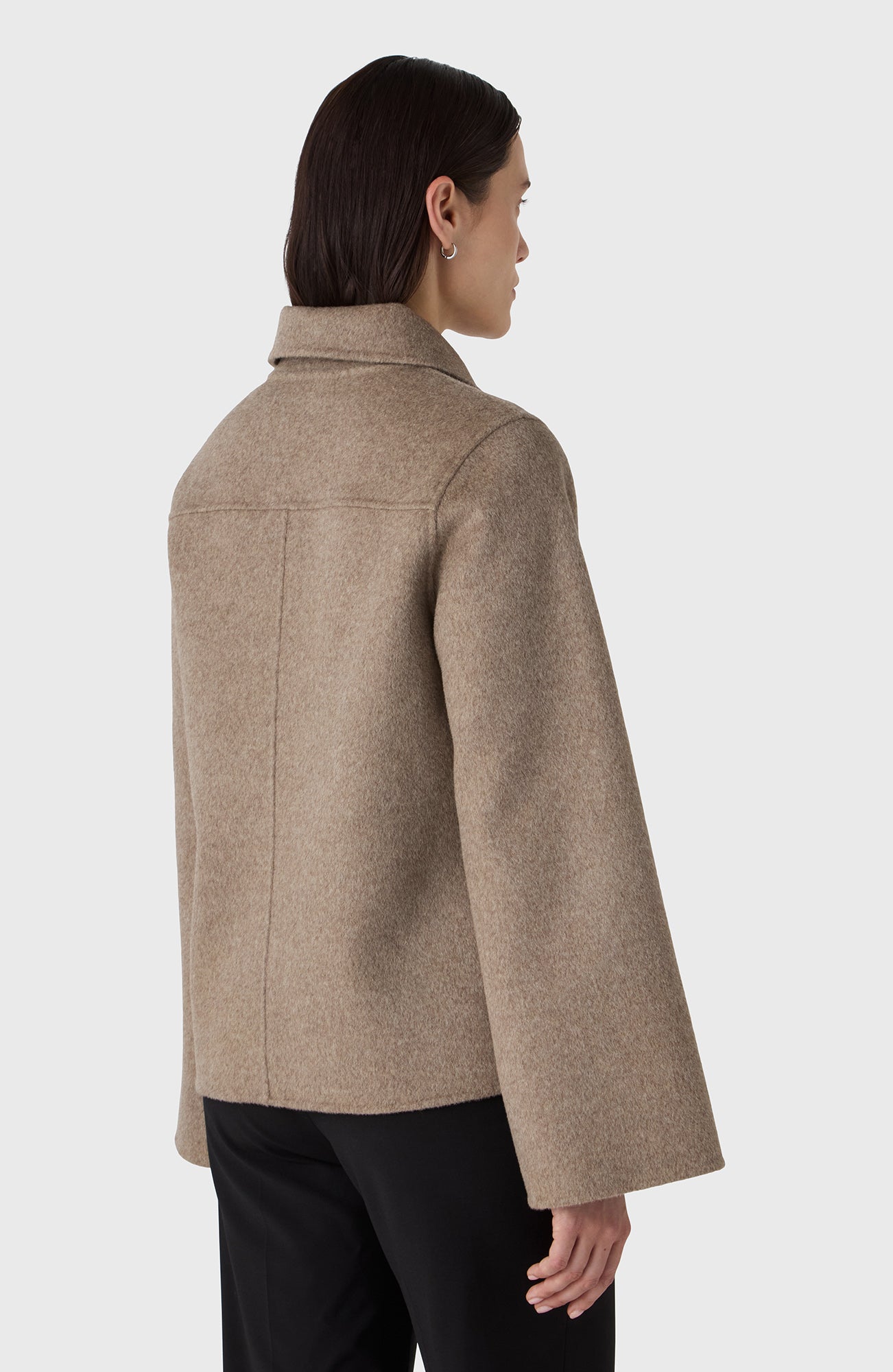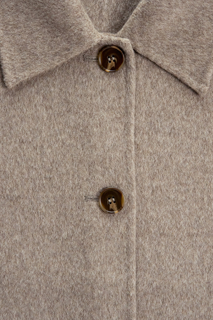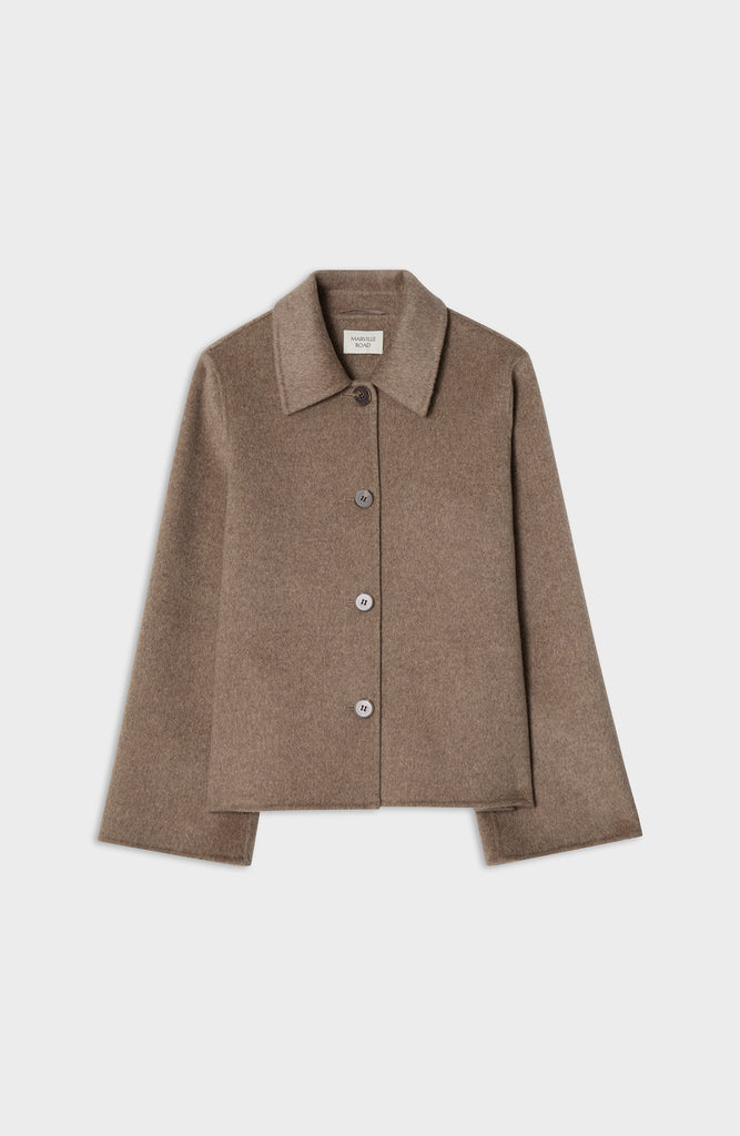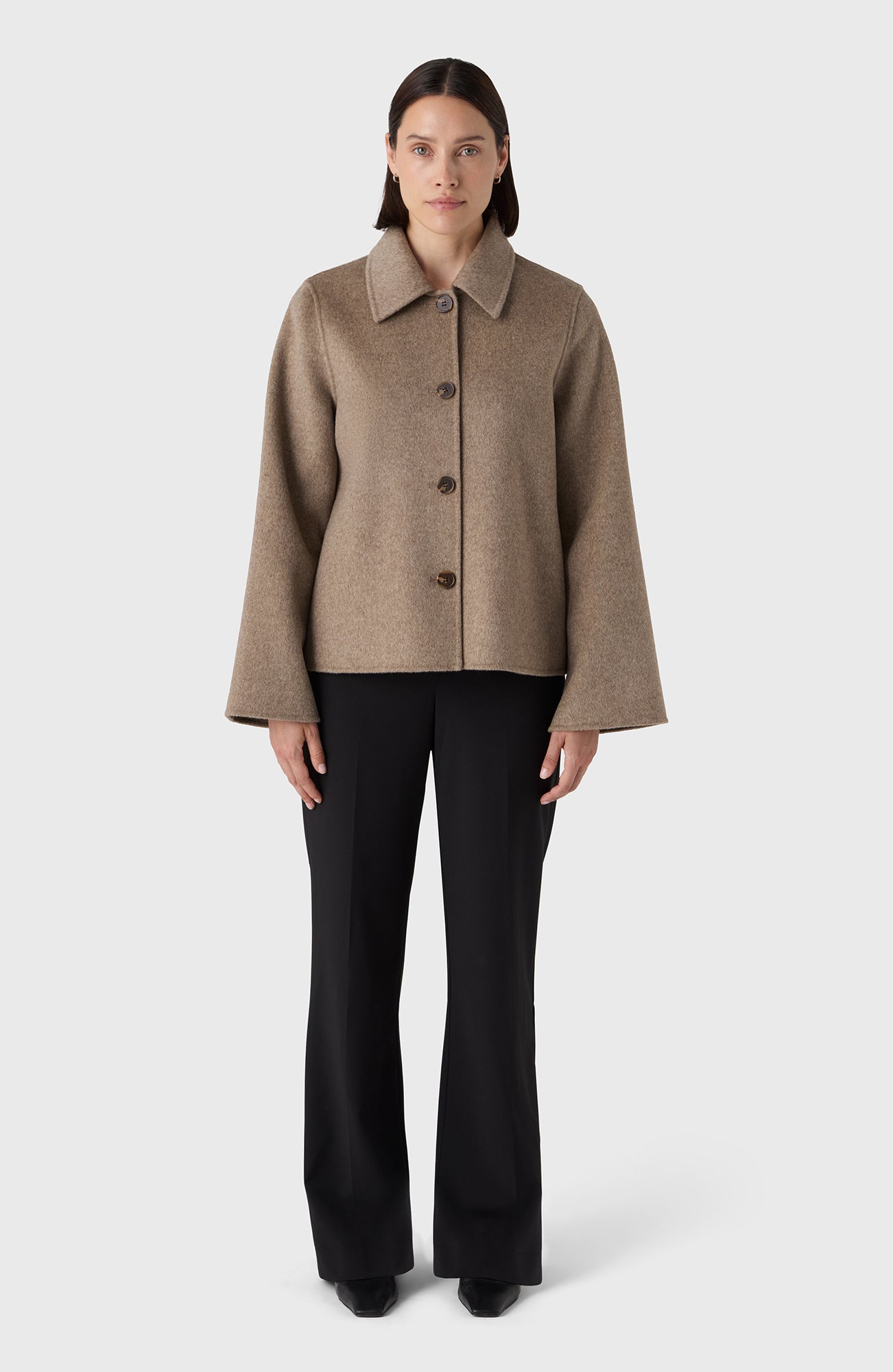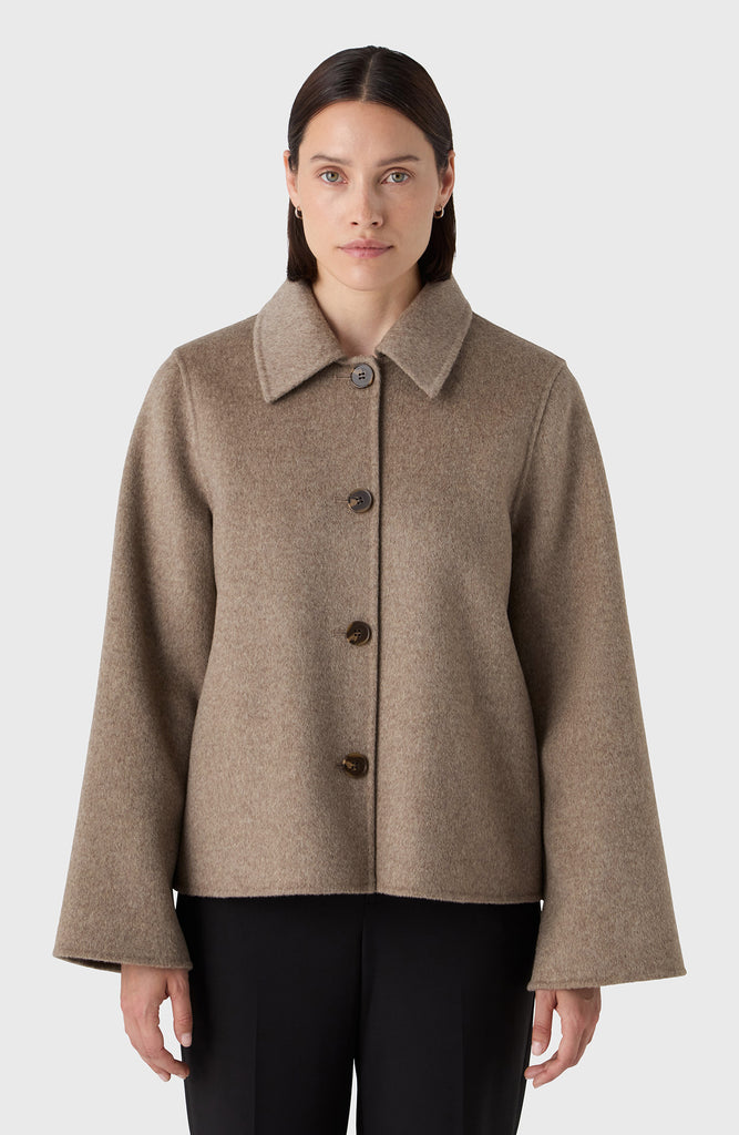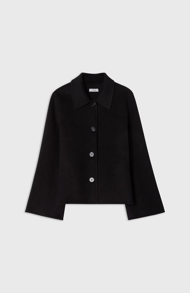 Soft structure with bold lines. The Coline Jacket is cut from 100% wool with a sculptural shape — featuring wide sleeves, a sharp shirt collar and tonal horn buttons. The cropped length balances volume and adds edge to any outfit. A modern layer for transitional dressing.