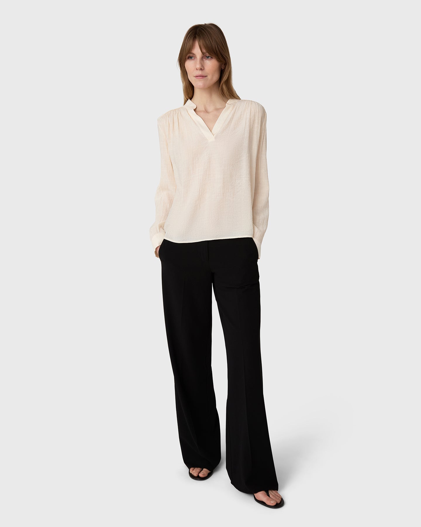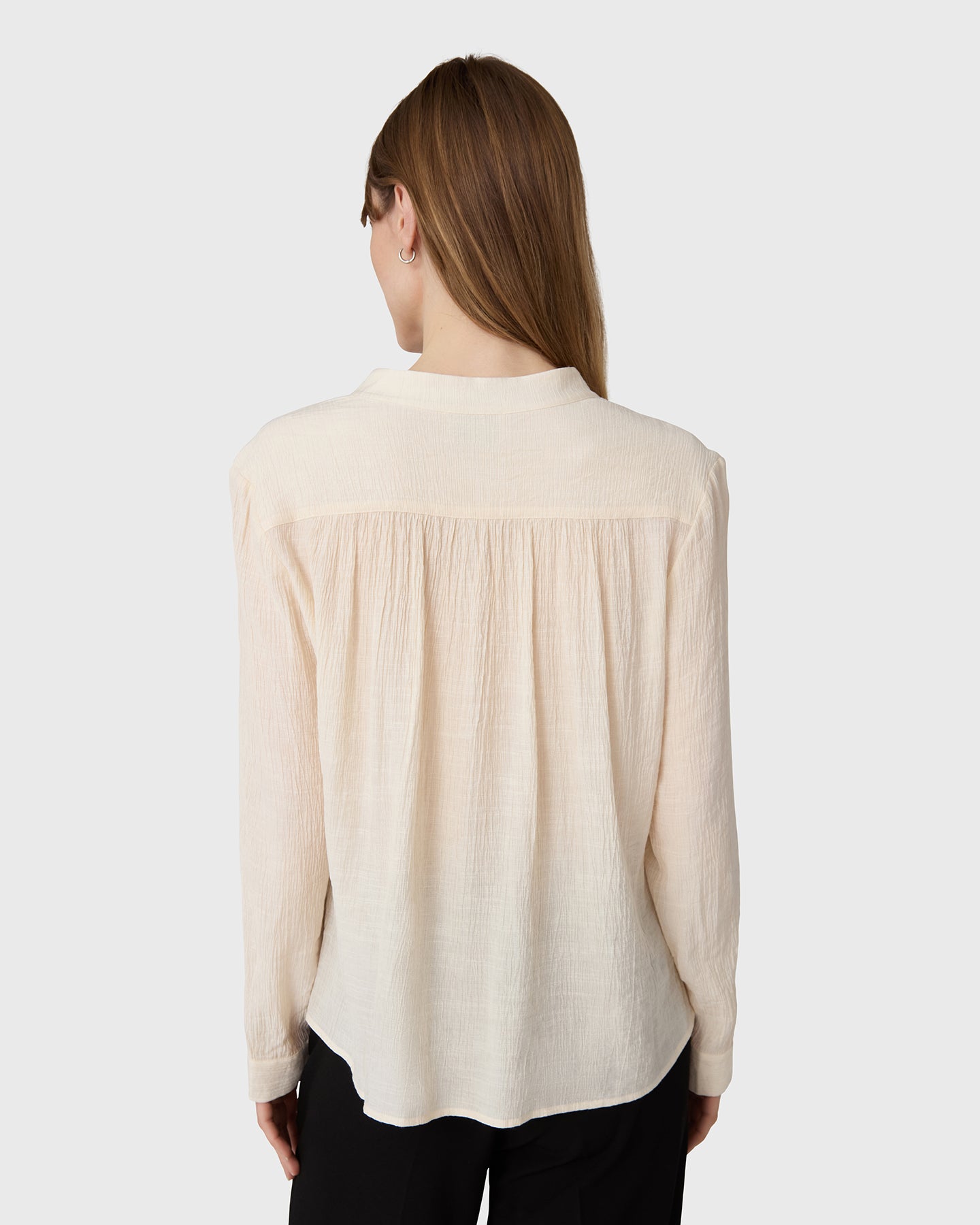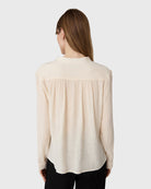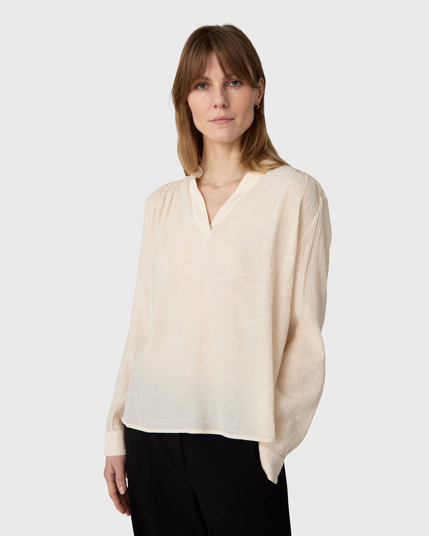 The Askia Blouse is a V-neck blouse with a slightly voluminous shape and a decorative button at the back, in lyocell with a light, subtly sheer quality.
