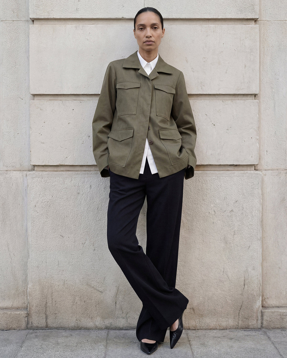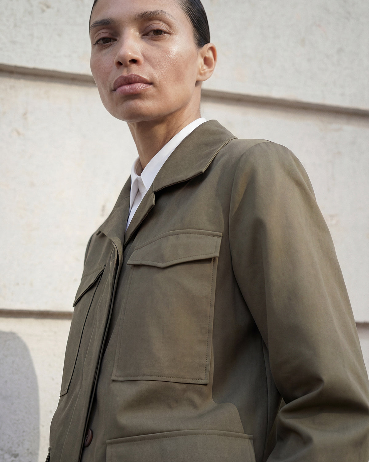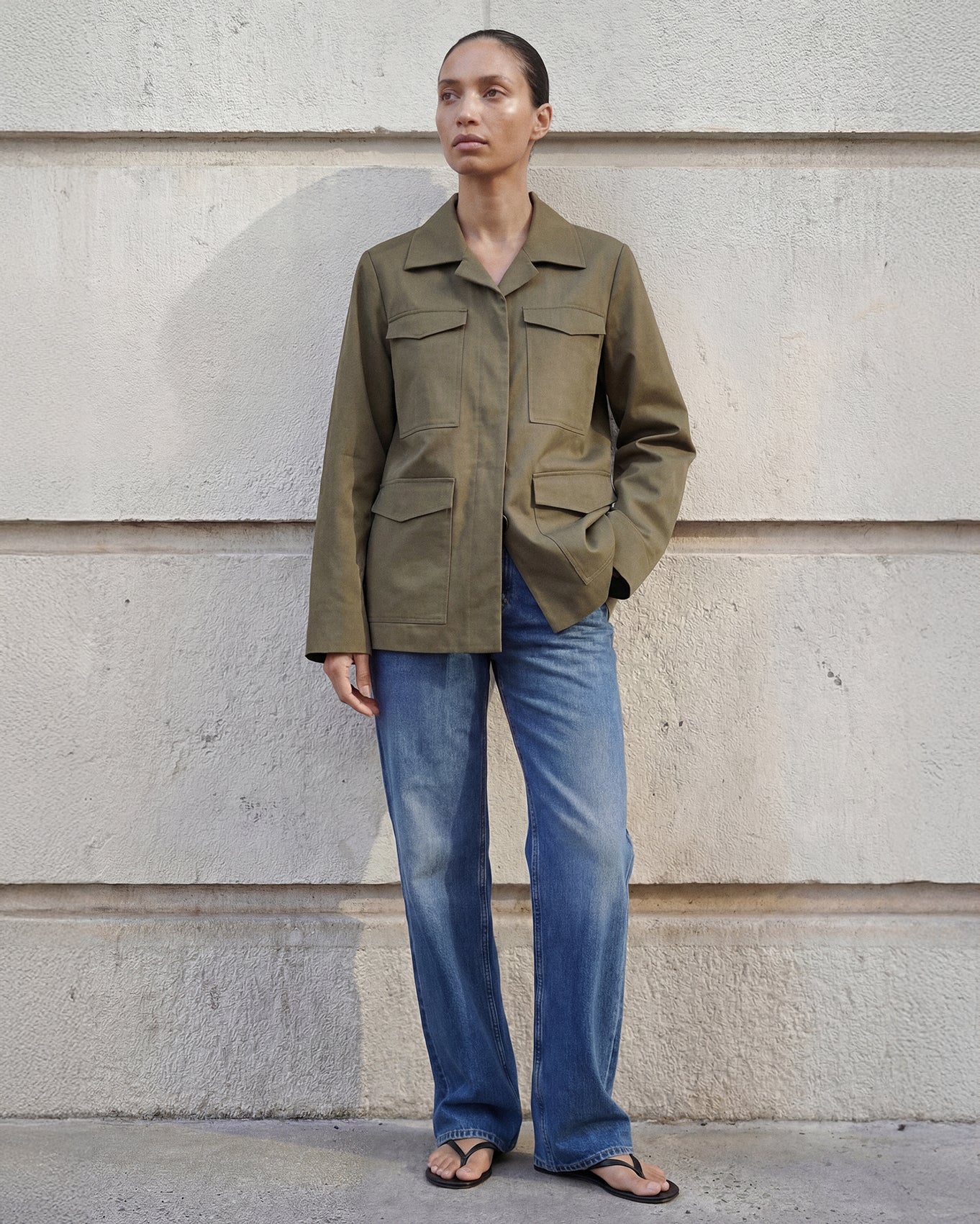 The Riley Cotton Army Jacket is crafted from soft, durable cotton, offering a fitted, slightly longer design with wider sleeves and a clean silhouette. Balancing structure and ease, it is a refined outer layer designed to move effortlessly through your day.
