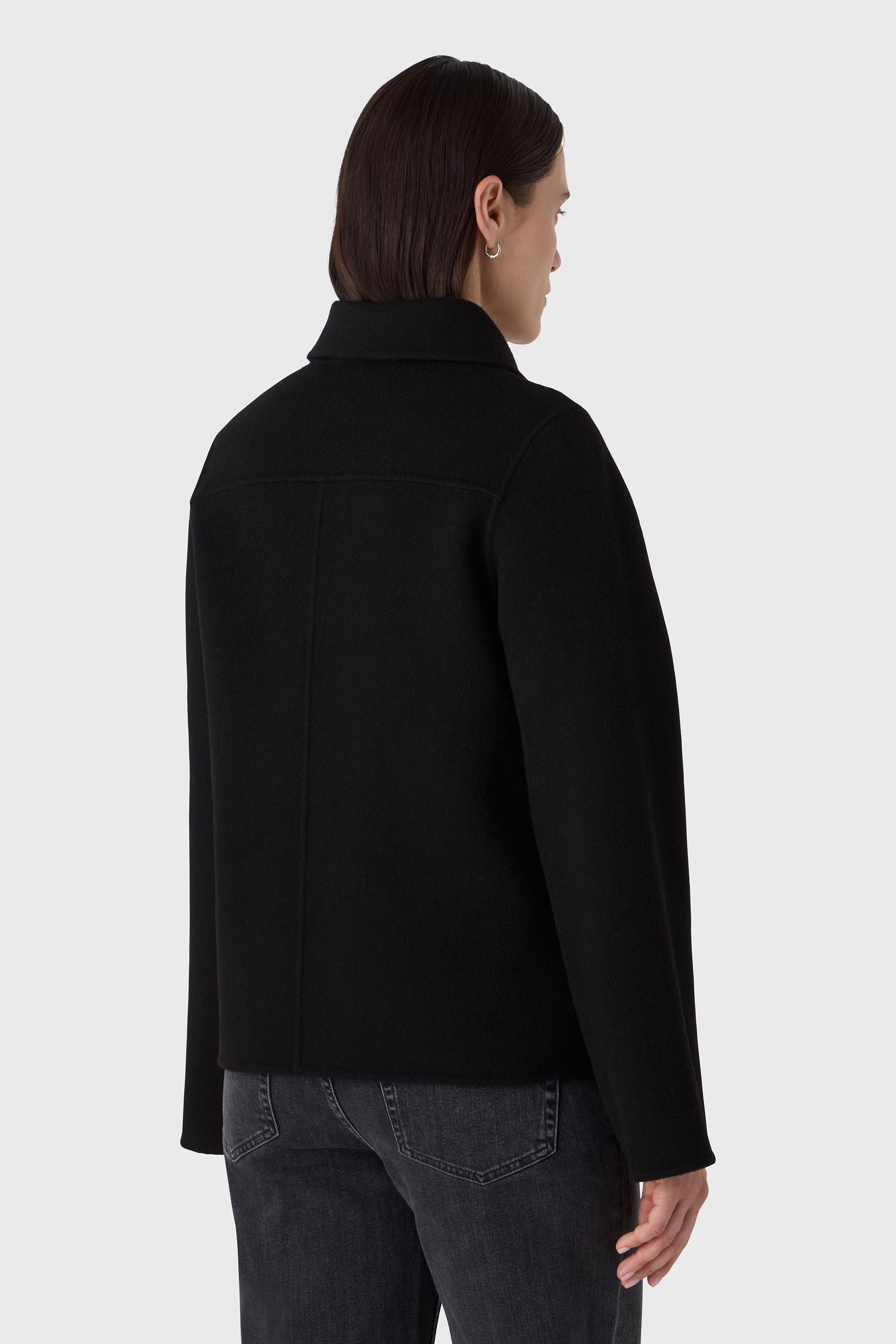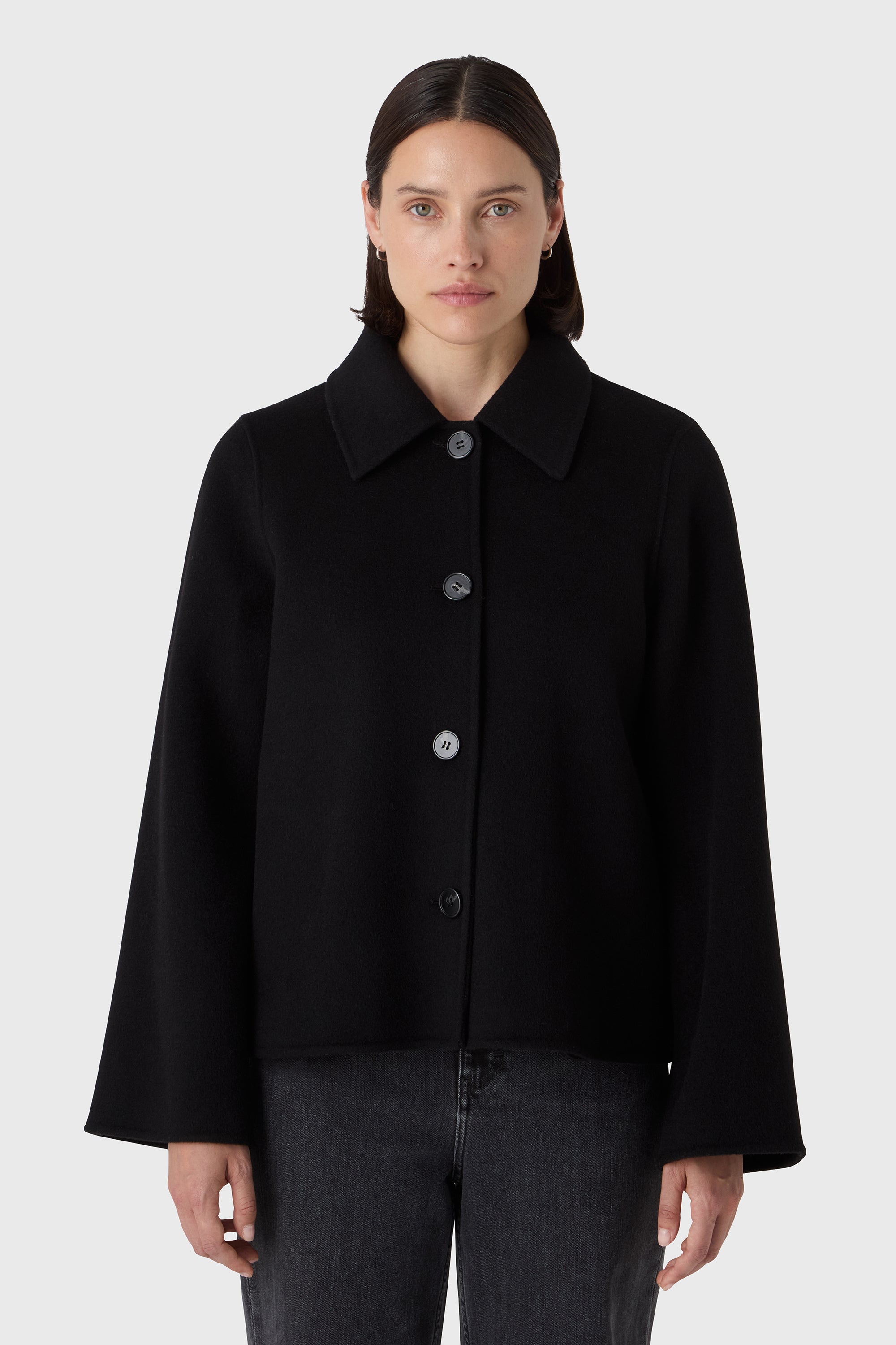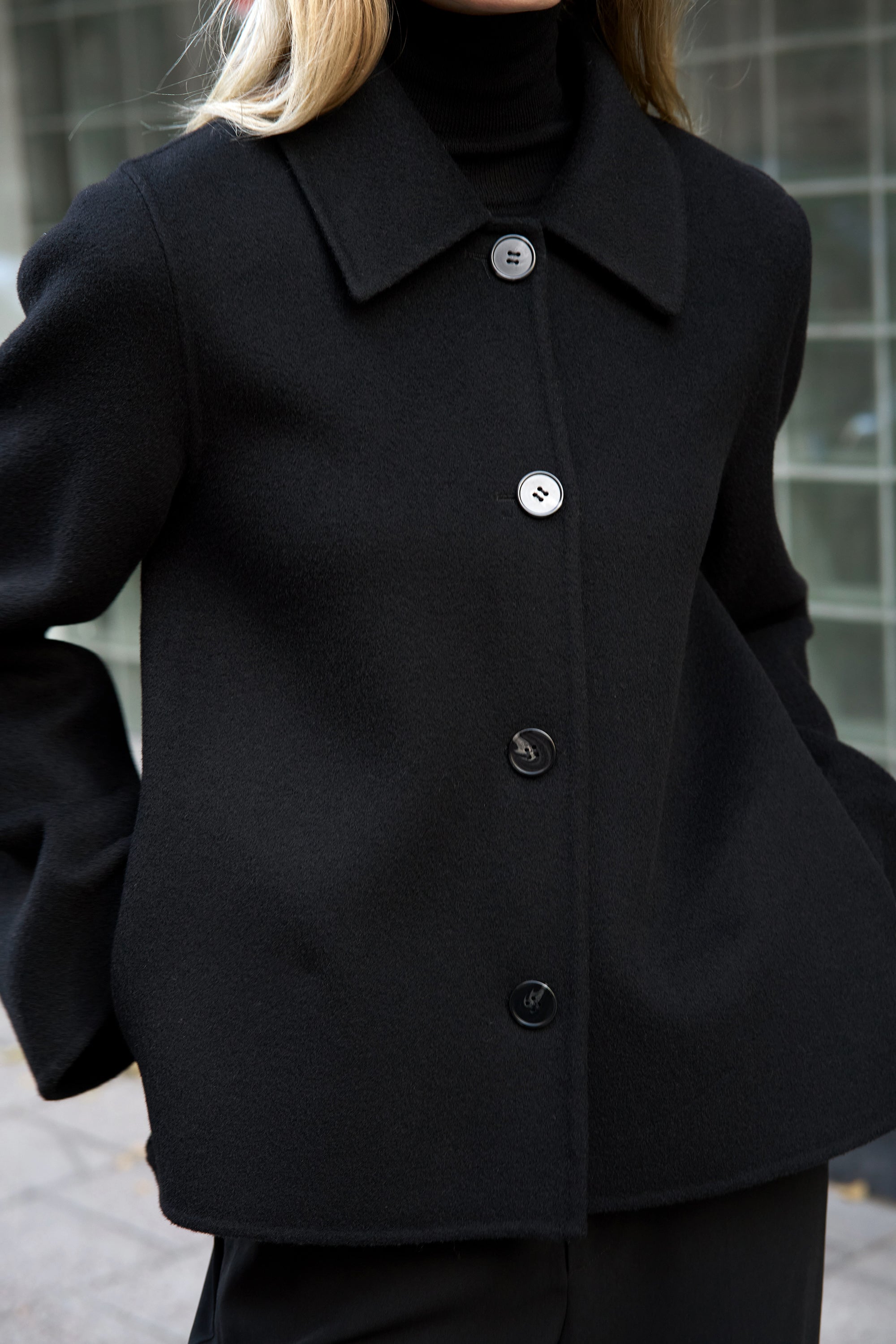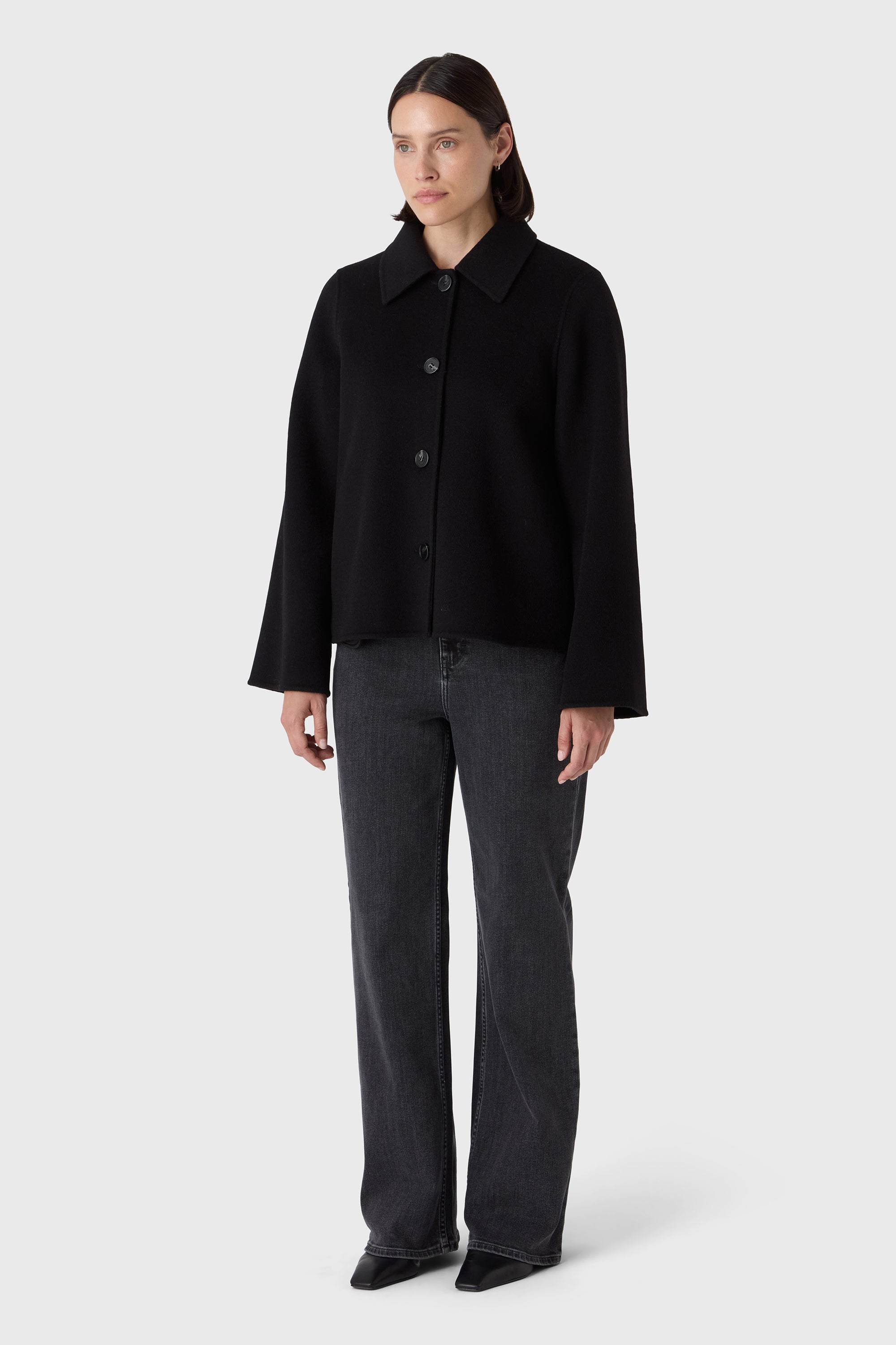 Soft structure with bold lines. The Coline Jacket is cut from 100% wool with a sculptural shape — featuring wide sleeves, a sharp shirt collar and tonal horn buttons. The cropped length balances volume and adds edge to any outfit. A modern layer for transitional dressing.