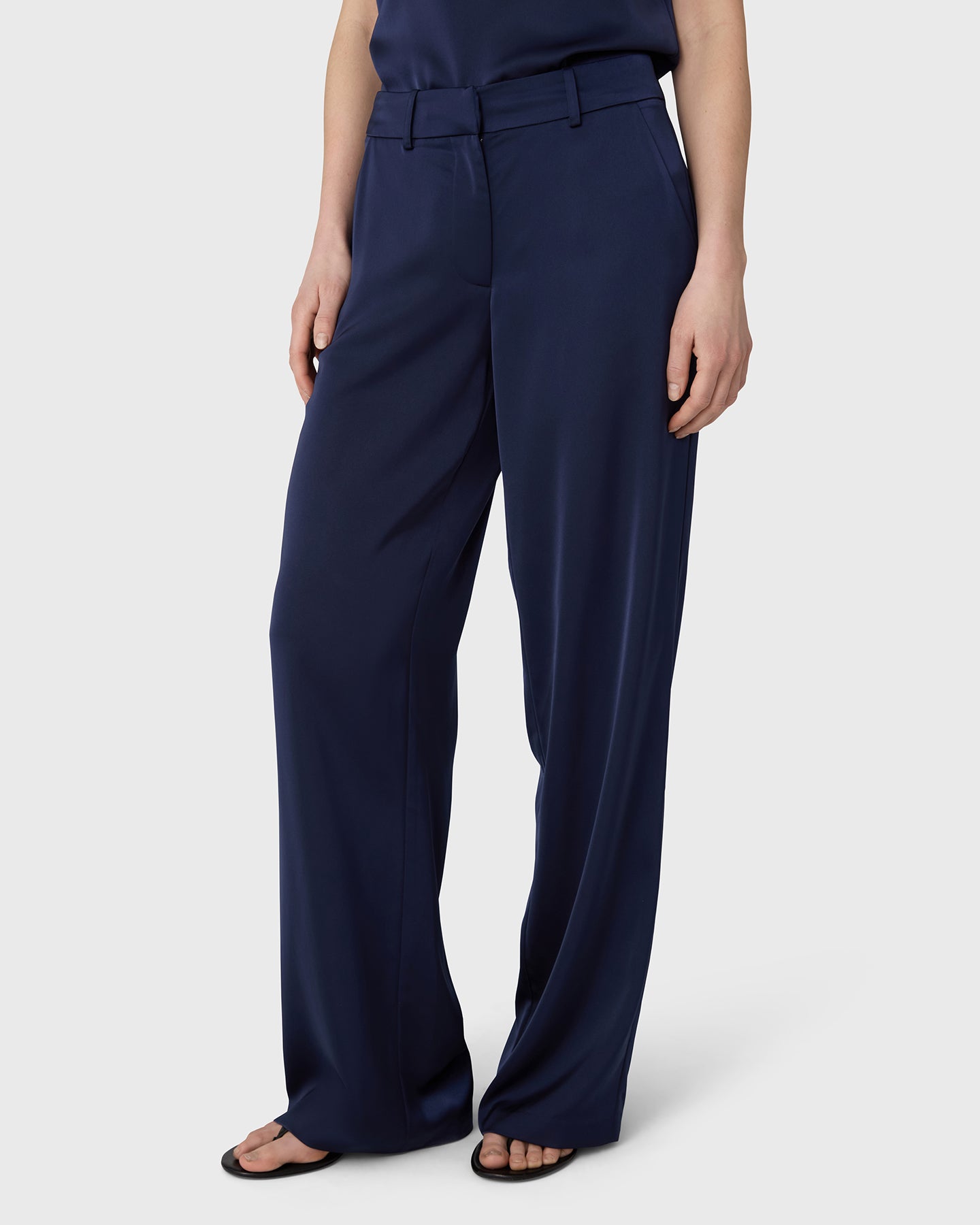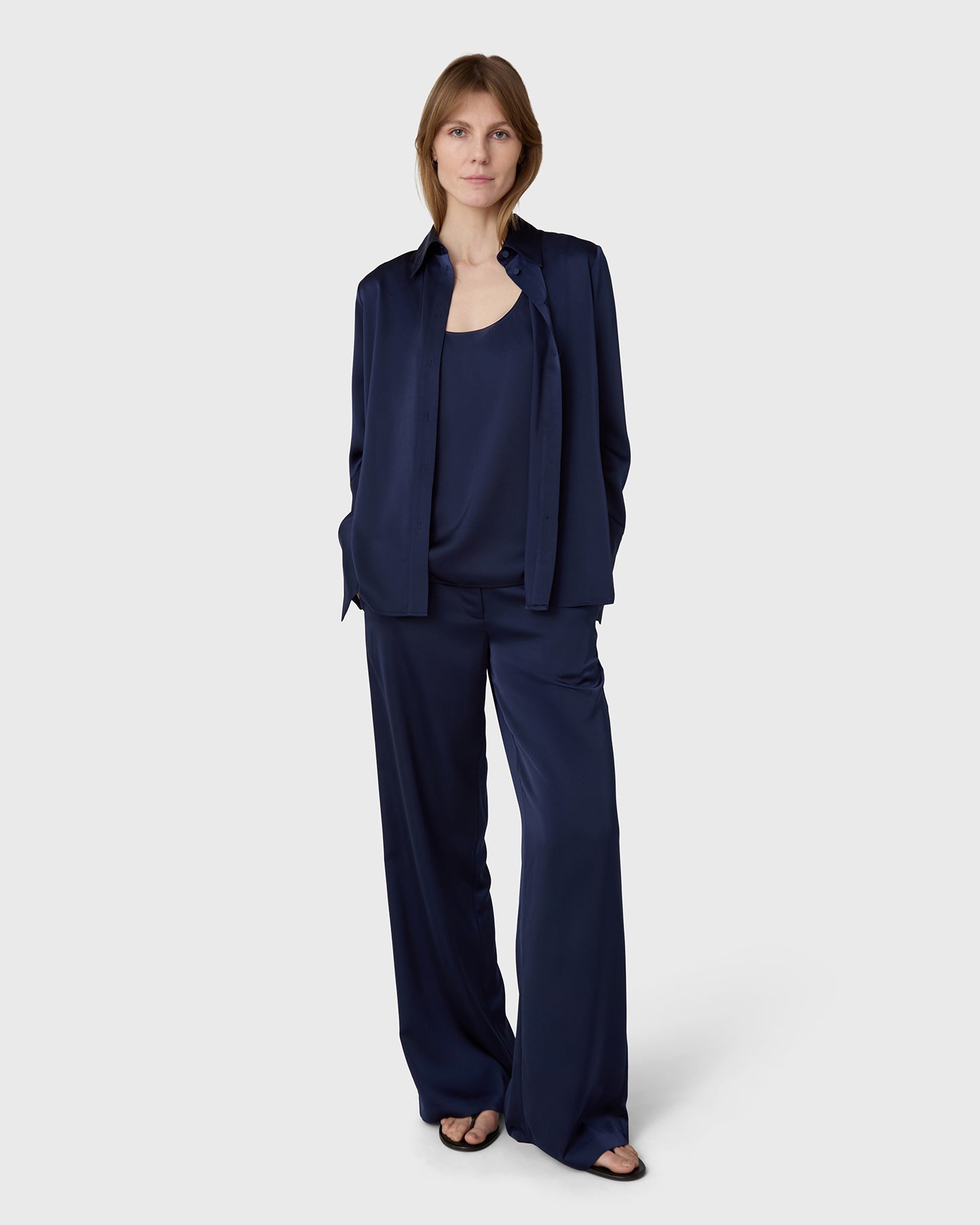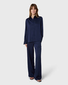 The Ingrid Satin Trousers är skurna med vida ben, midjehög passform och frontdragkedja som ger en ren silhuett. Satin stretch ger ett mjukt, följsamt fall som fungerar lika väl i ett mer uppklätt sammanhang som i en avslappnad styling.