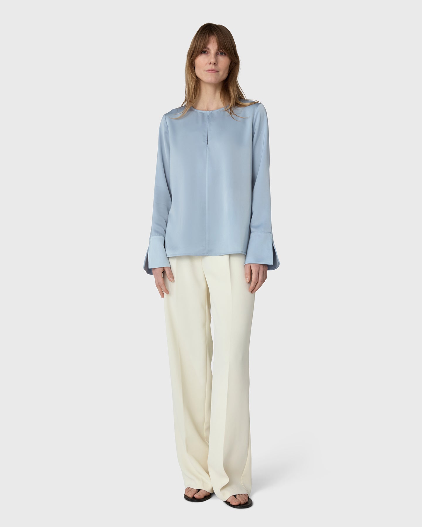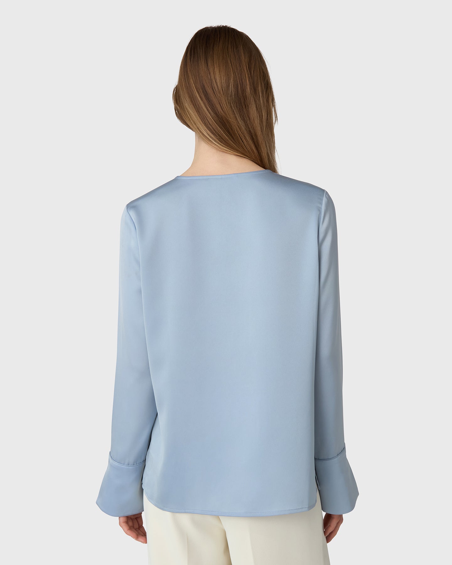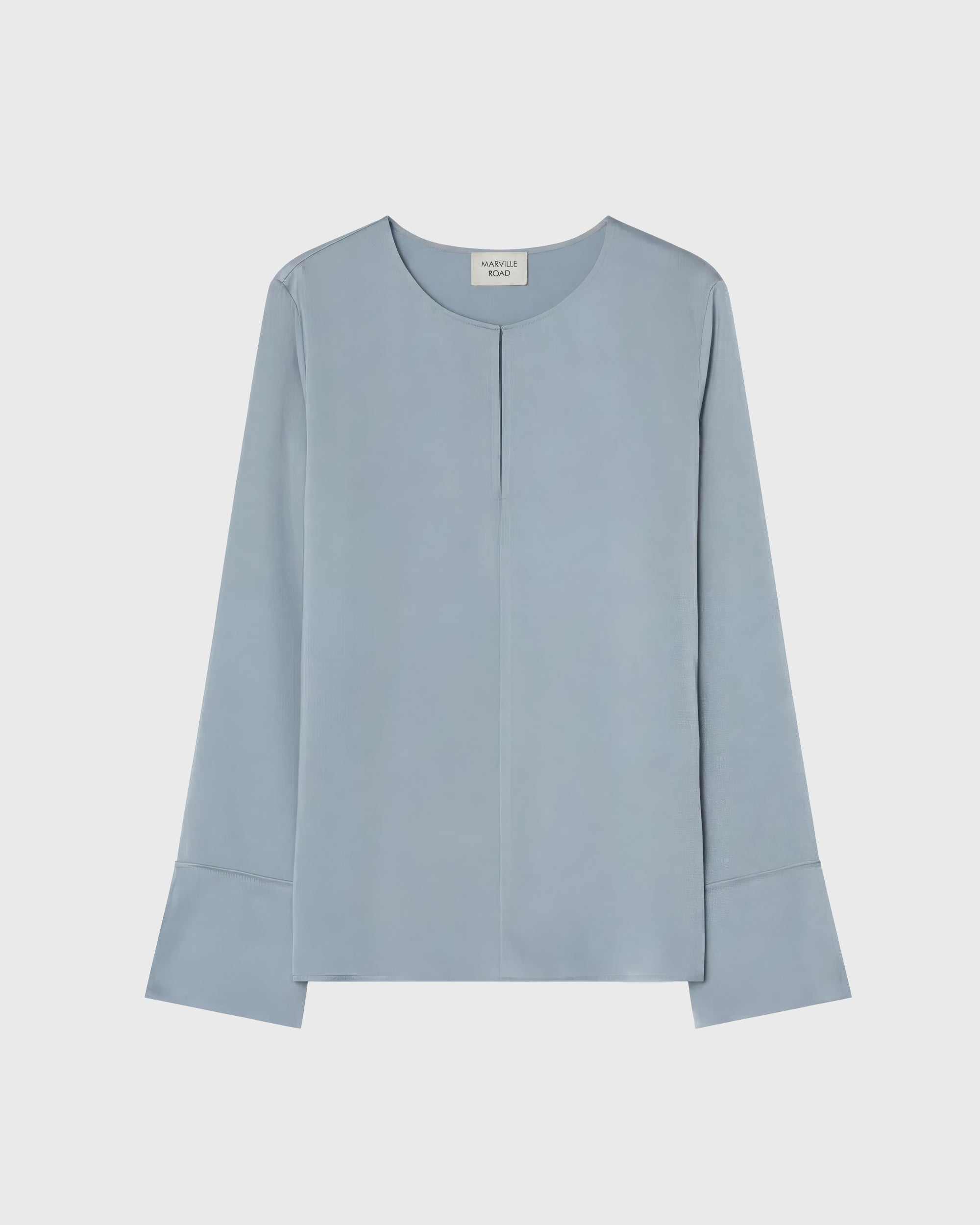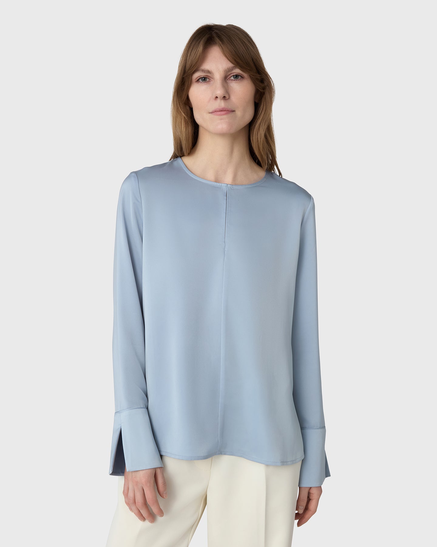 En tidlös klassiker med en mjuk twist. Angela Blus är skuren i följsam satin stretch och har en rund halsringning med en feminin slits framtill. De diskreta manschetterna ger en skräddad avslutning till den avslappnade silhuetten, vilket gör den lika självklar på kontoret som middagen. Stoppa in den i byxor eller bär den lös för en nedtonad elegans.
